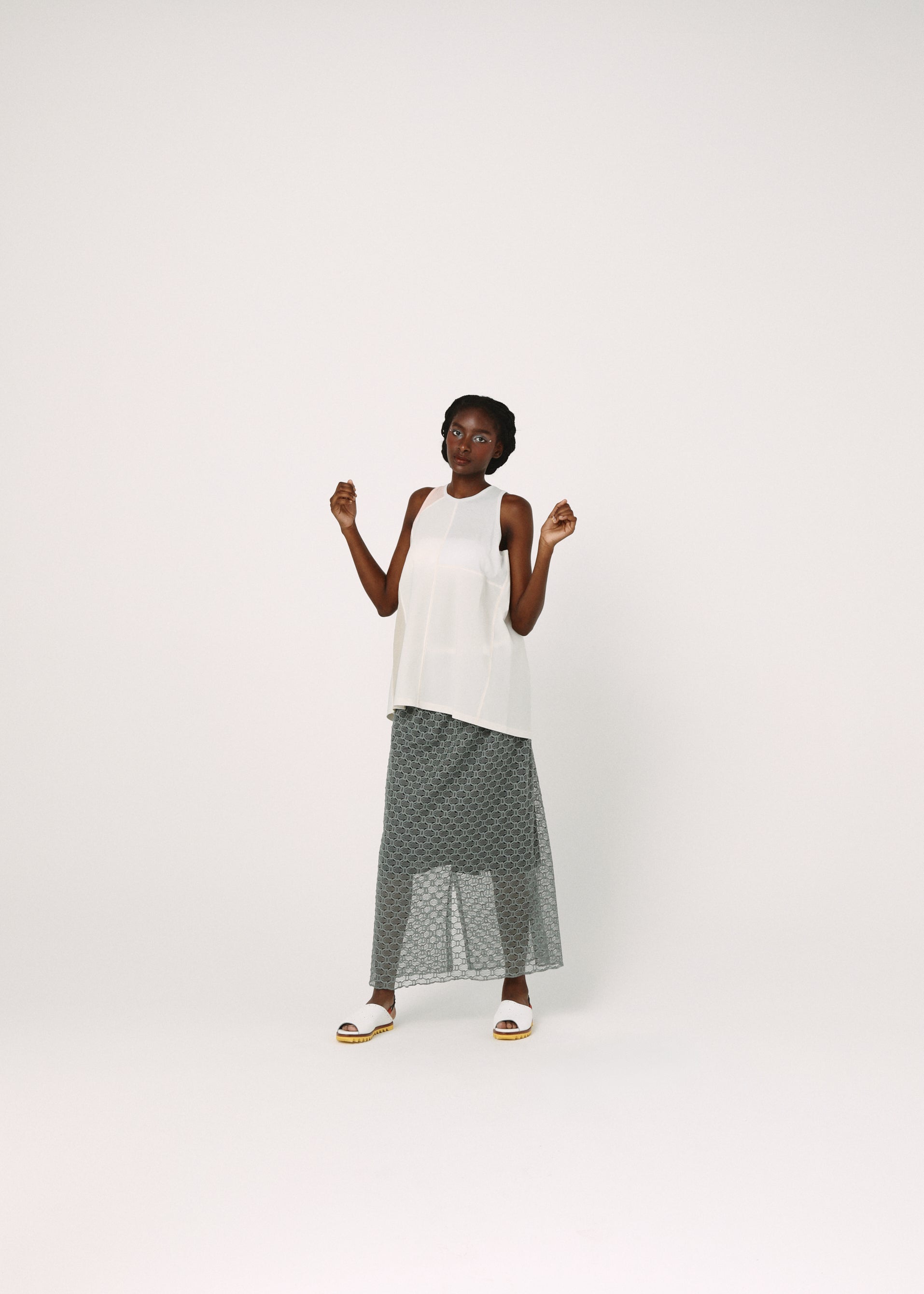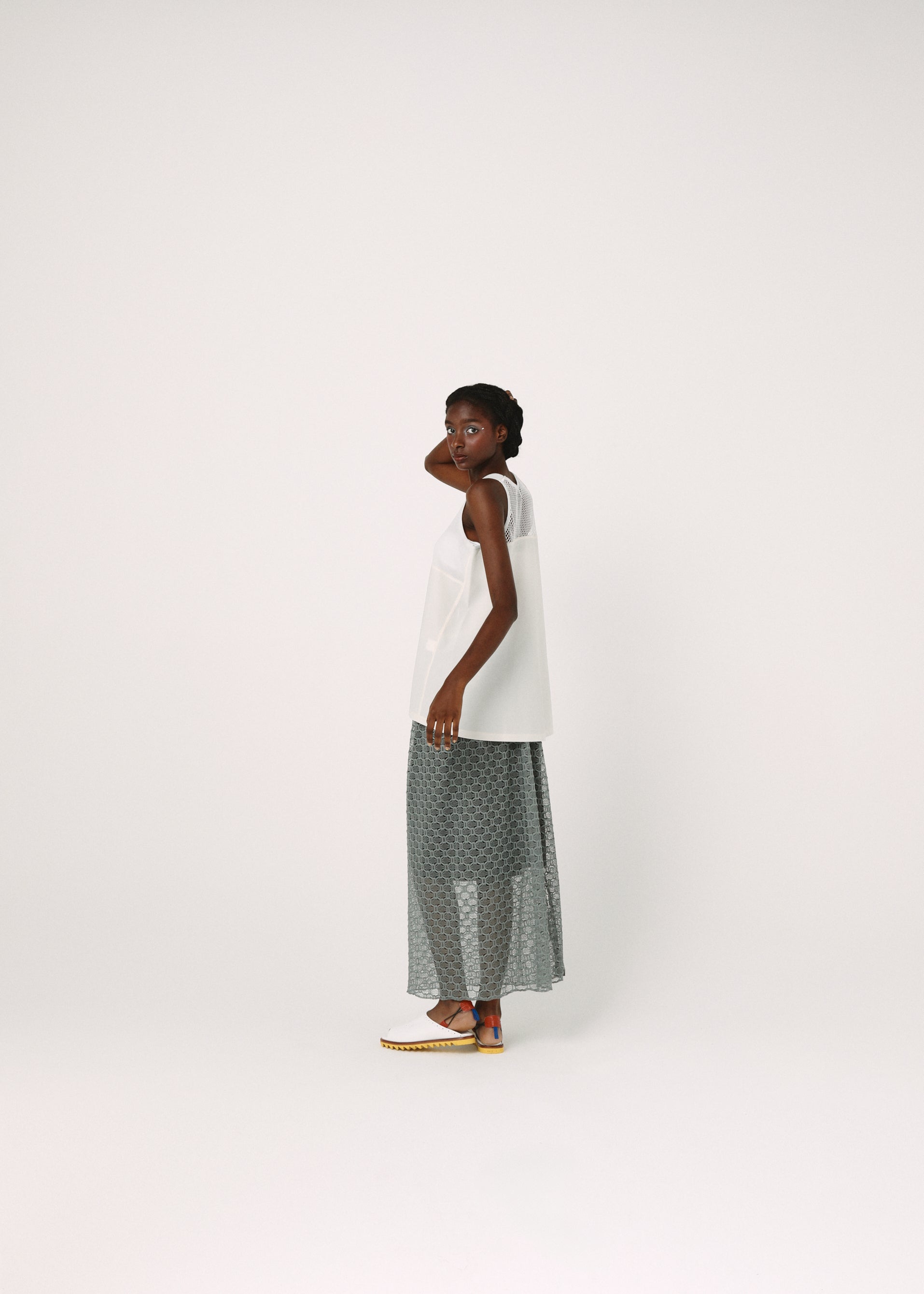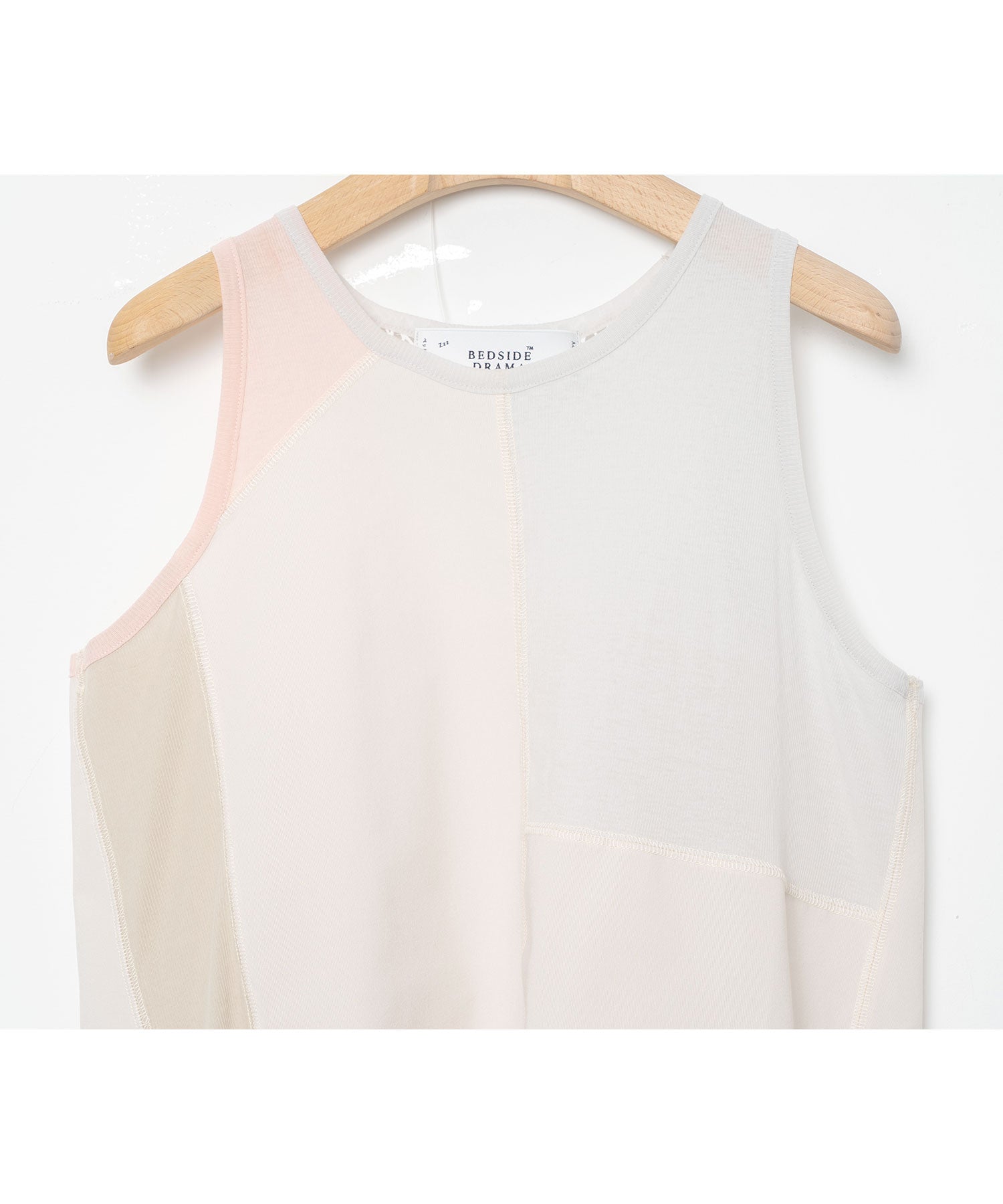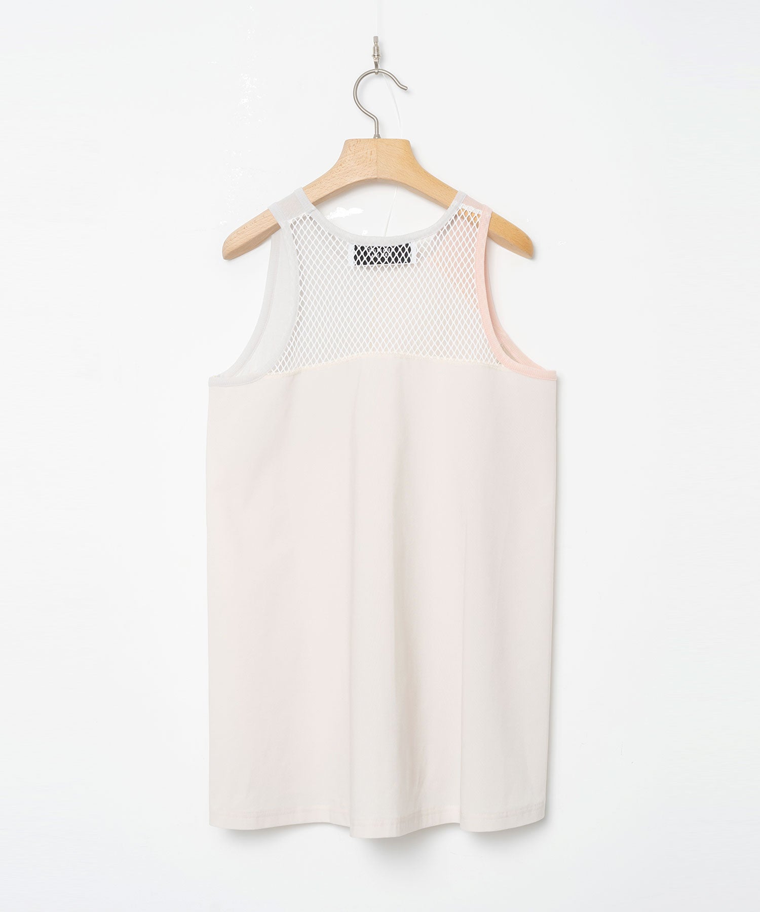 絶妙な異素材使いが小気味良く、涼しげなトップです。サイズ1は丈長めのタンクトップ。サイズ2はタンクワンピースとして1枚でご着用いただけます。