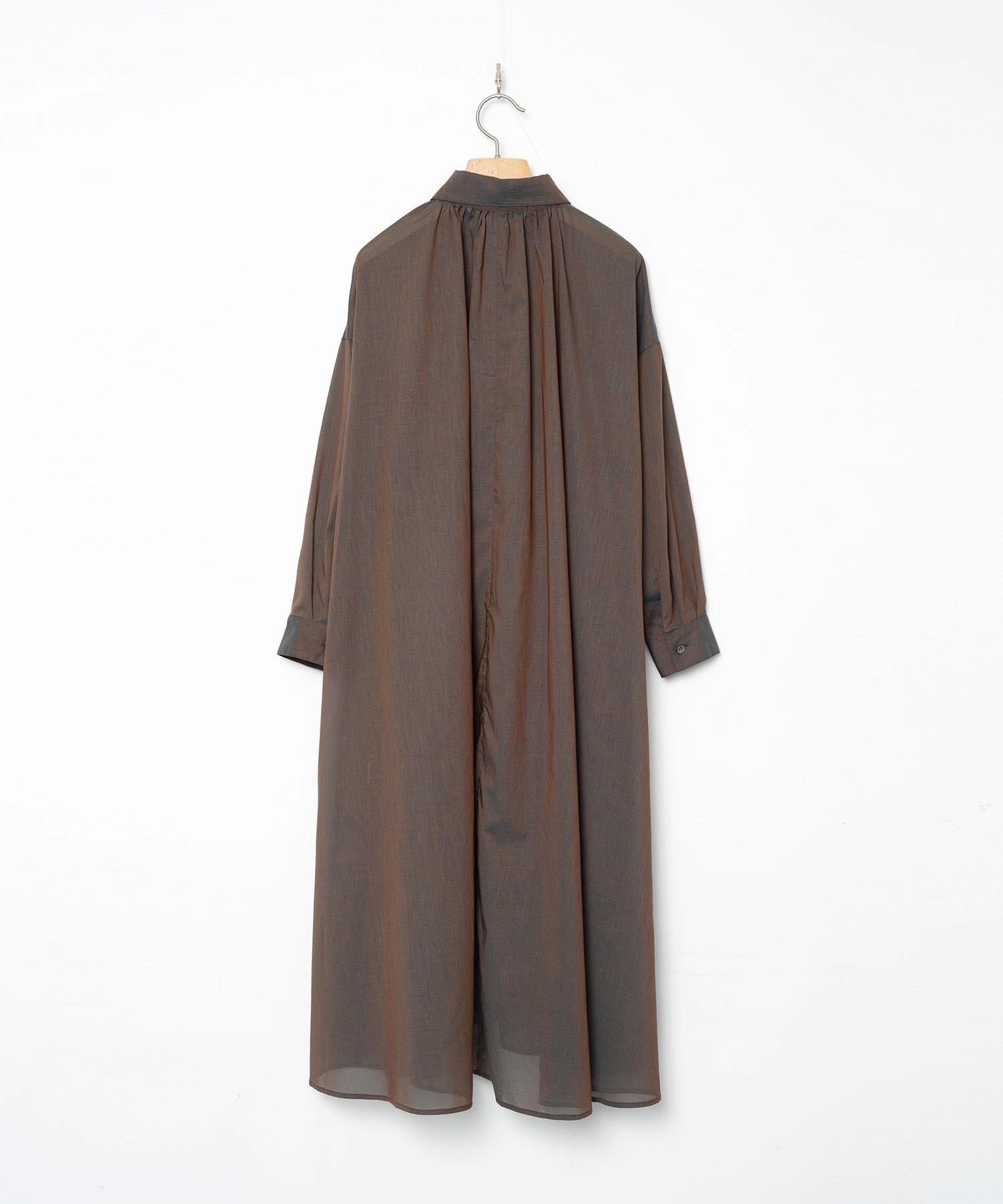 見る角度で色が変わって見える特殊な織り方をした生地を贅沢につかったシャツワンピース。