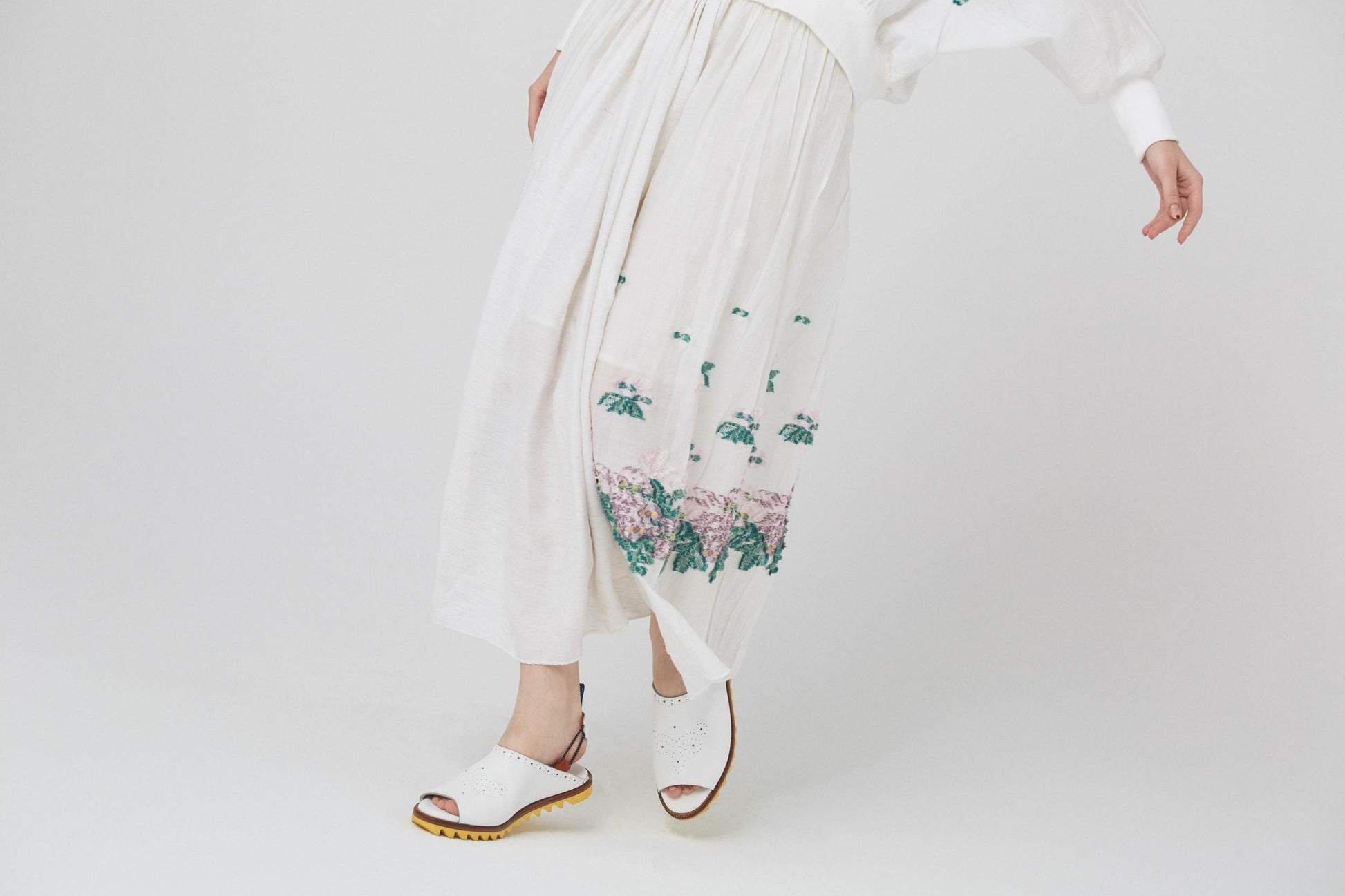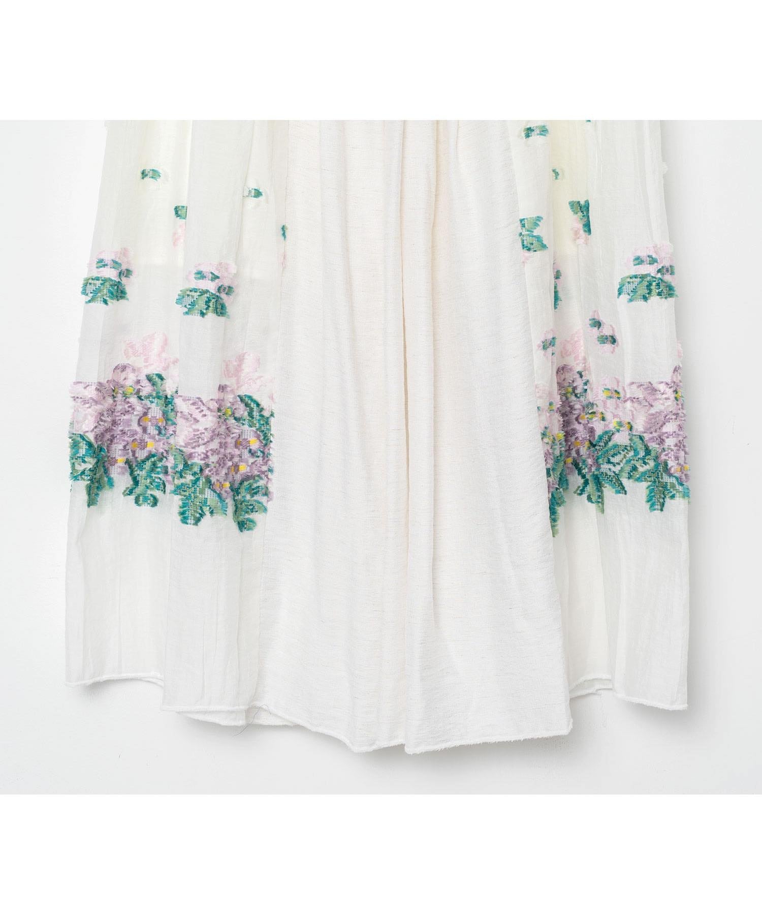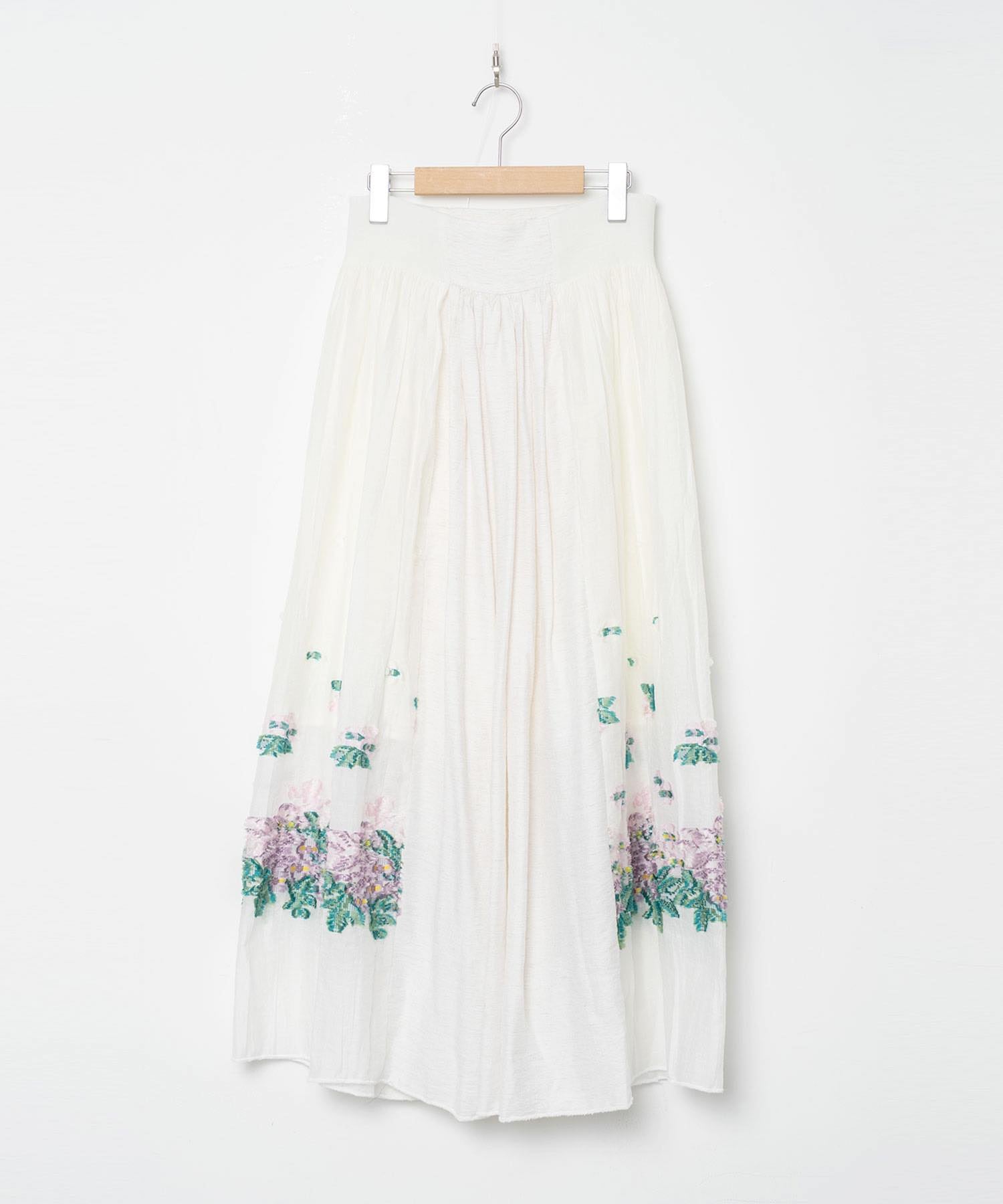 絶妙な配色のオリジナルのフラワーカットジャカードが控えめに主張する、心が浮き立つようなスカートです。