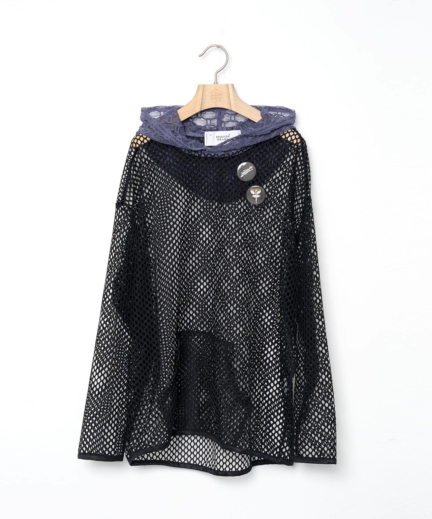 大胆なメッシュ使いが特徴的なレーシーパーカー。フード部分には繊細に織り上げられた配色のレースを使用しており、フードをかぶるとさらに可愛いとスタッフ間で評判です。やや難易度高めのレイヤー必須アイテムですが、速乾イージーケアということもあり、水着に組み合わせても間違いなし◎