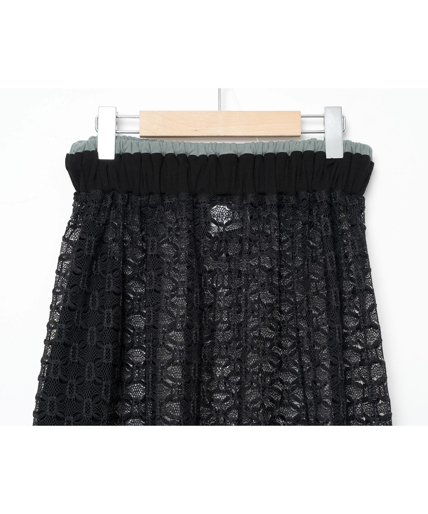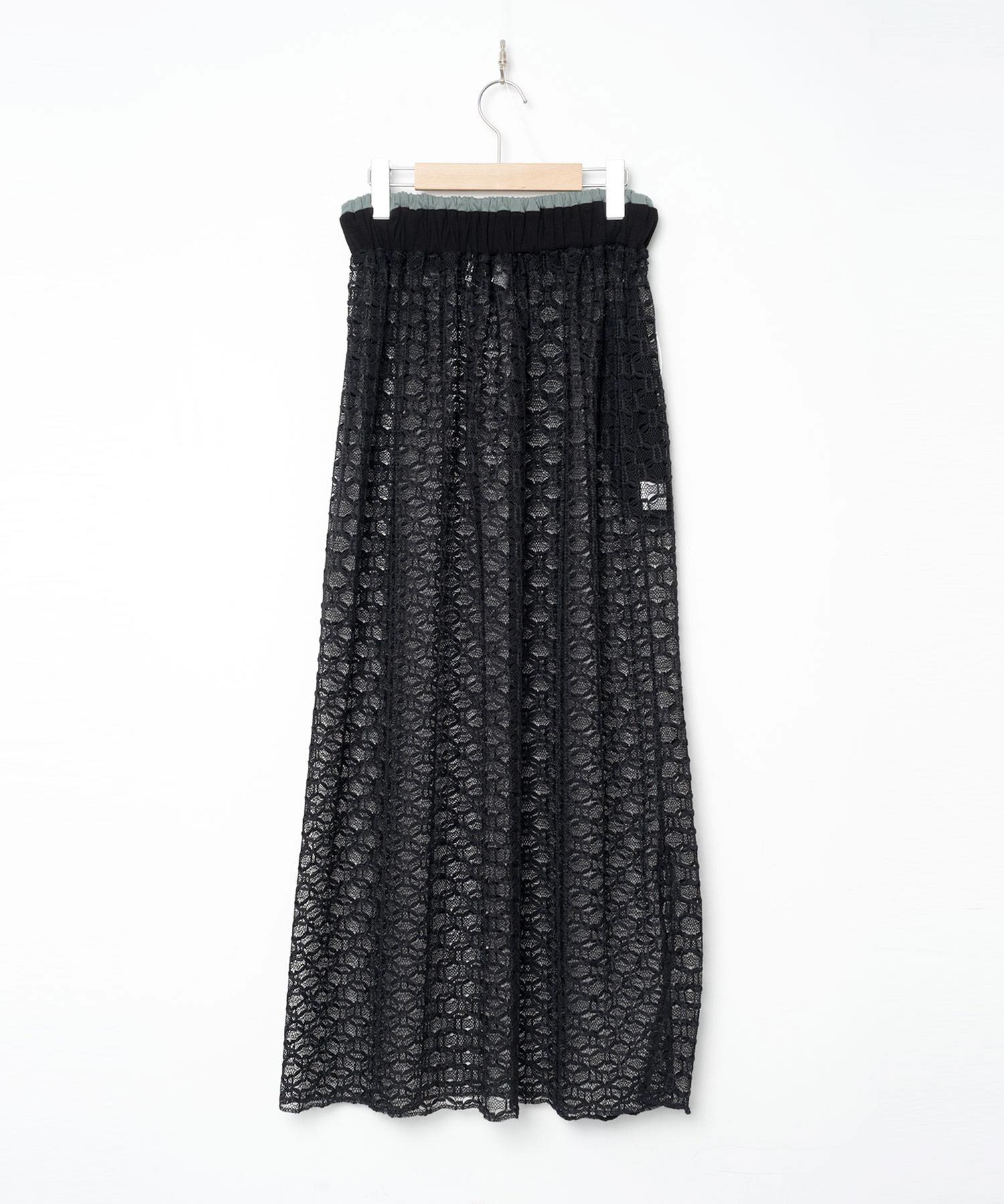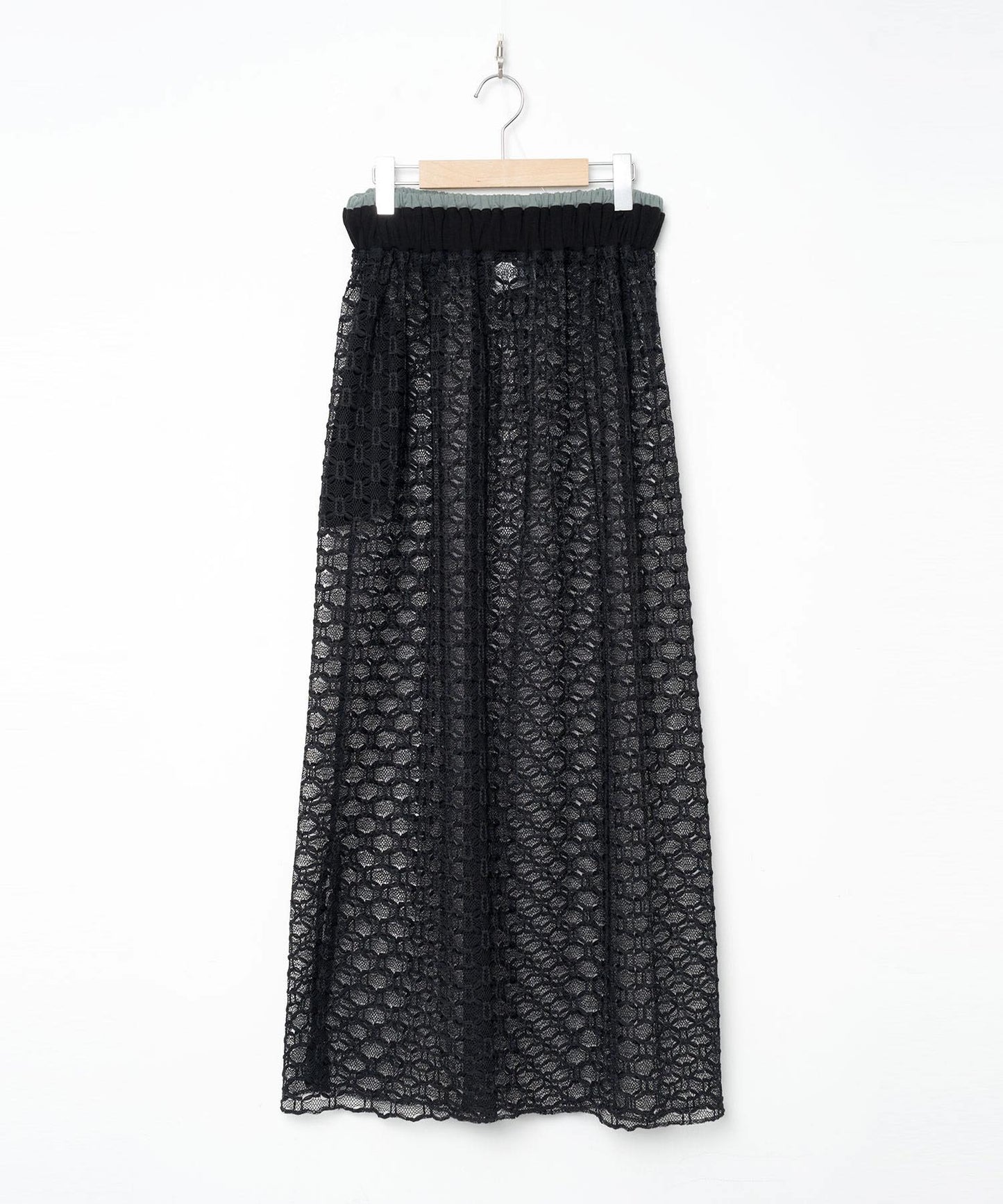 繊細に織り上げられたレースで仕立てたロングスカート。中級者向けの重ね着アイテムですが、シックな色目で意外に使いやすいと評判です。太めのジーンズなんかに重ねてもいい感じ。
