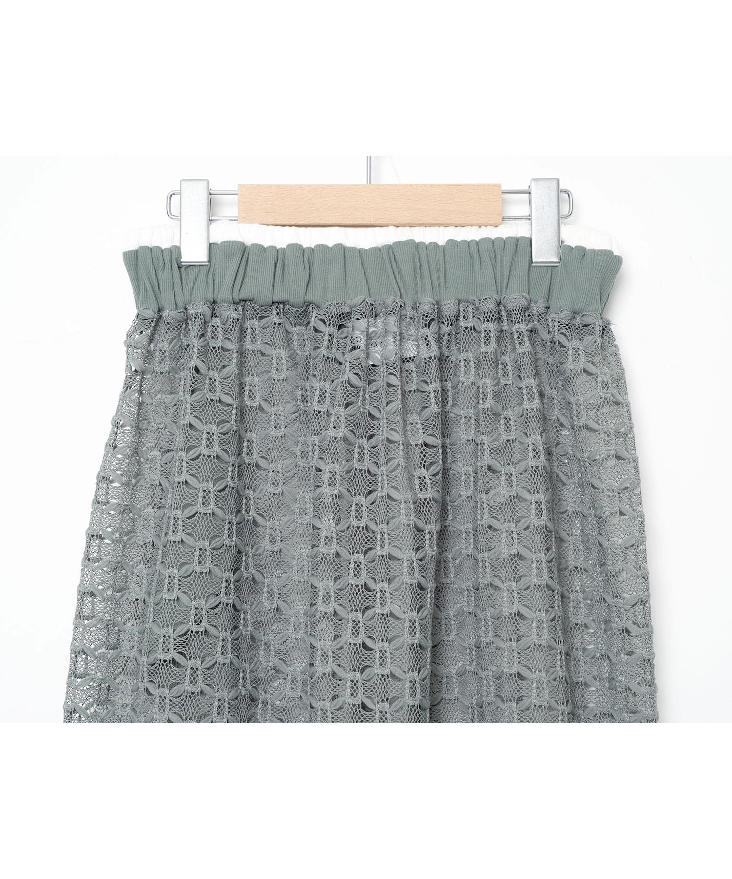 繊細に織り上げられたレースで仕立てたロングスカート。中級者向けの重ね着アイテムですが、シックな色目で意外に使いやすいと評判です。太めのジーンズなんかに重ねてもいい感じ。