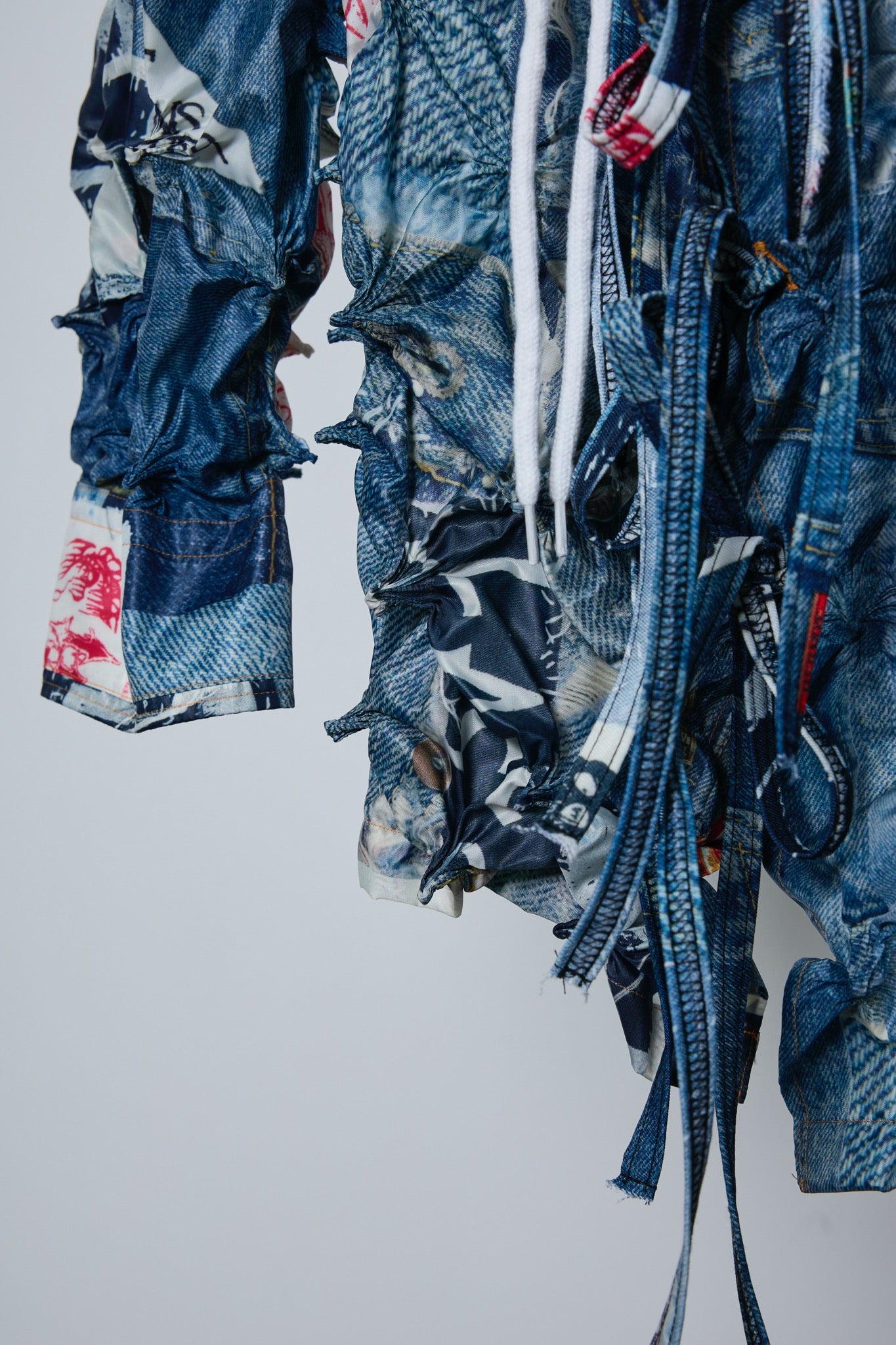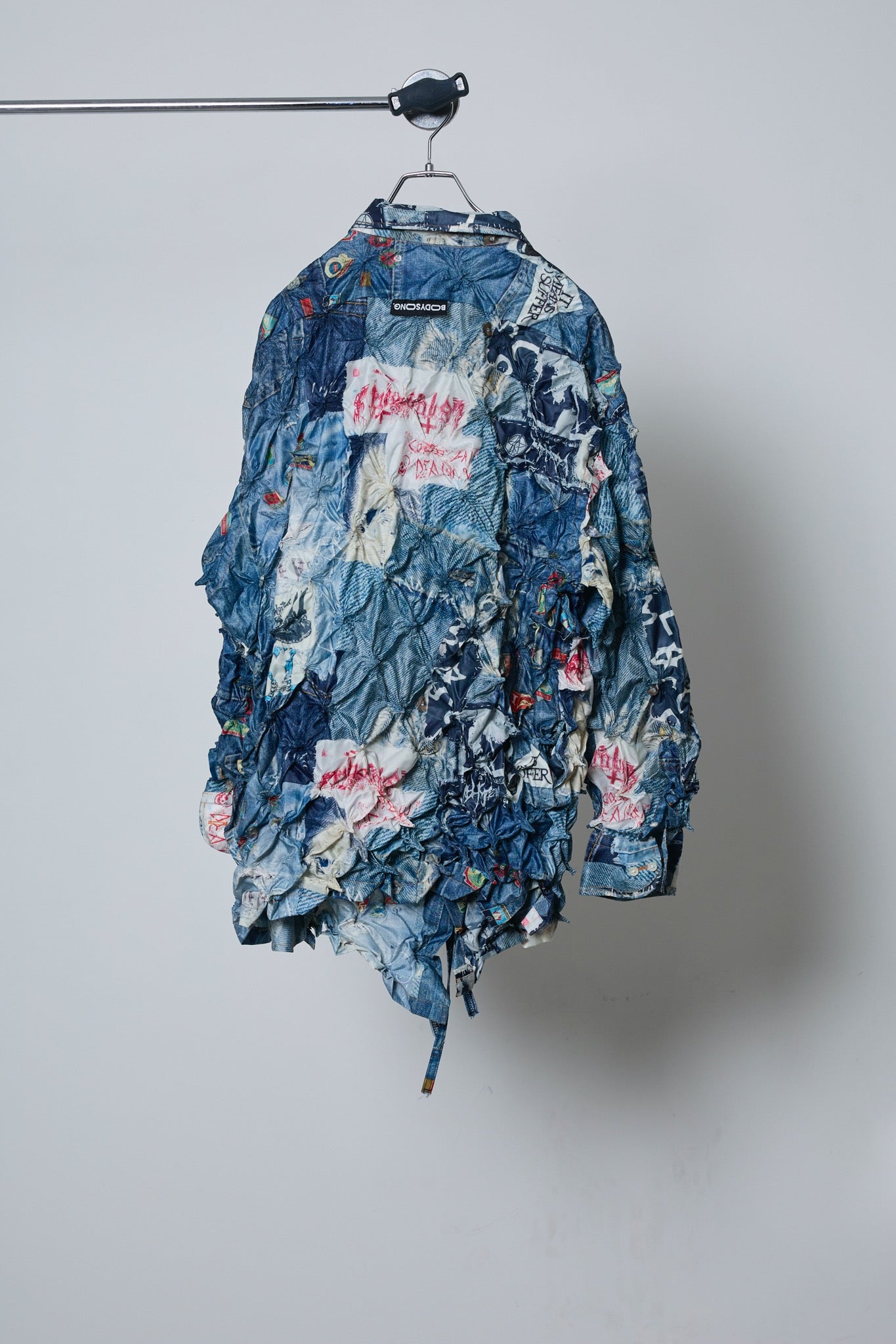 ヴィンテージデニムやワッペン、ピンバッジ、ミリタリーウエアなどをコラージュしたプリント生地を使用した、唯一無二の存在感を放つシャツ。有松絞りの職人が、あえて大きめのシャツを加工することで、独特のシルエットと風合いを表現しました。一部のボタンには、ヴィンテージのサイコロを使用し、遊び心をプラス。JUVENILE HALL ROLLCALLとの裏コラボレーションアイテム。