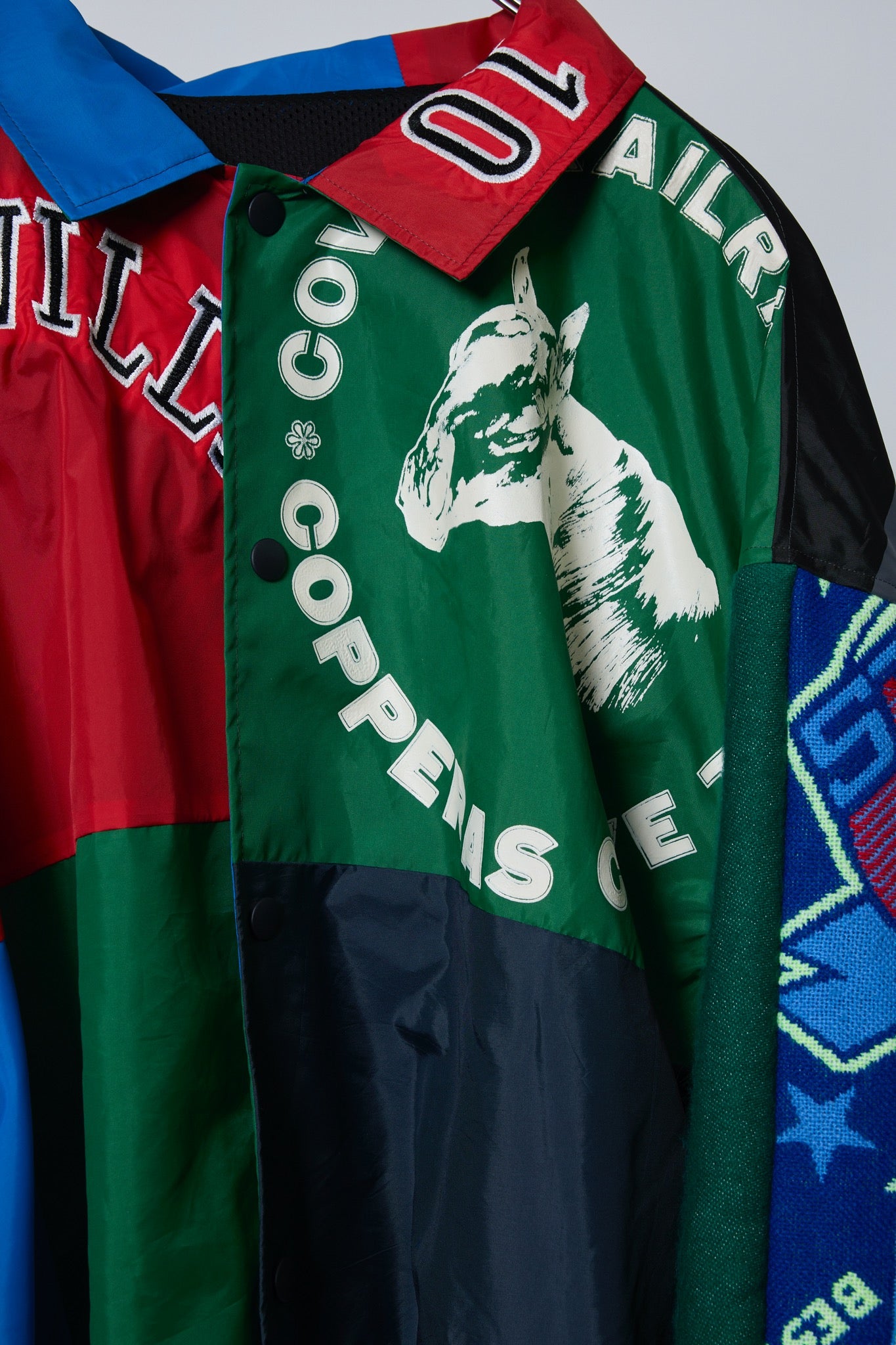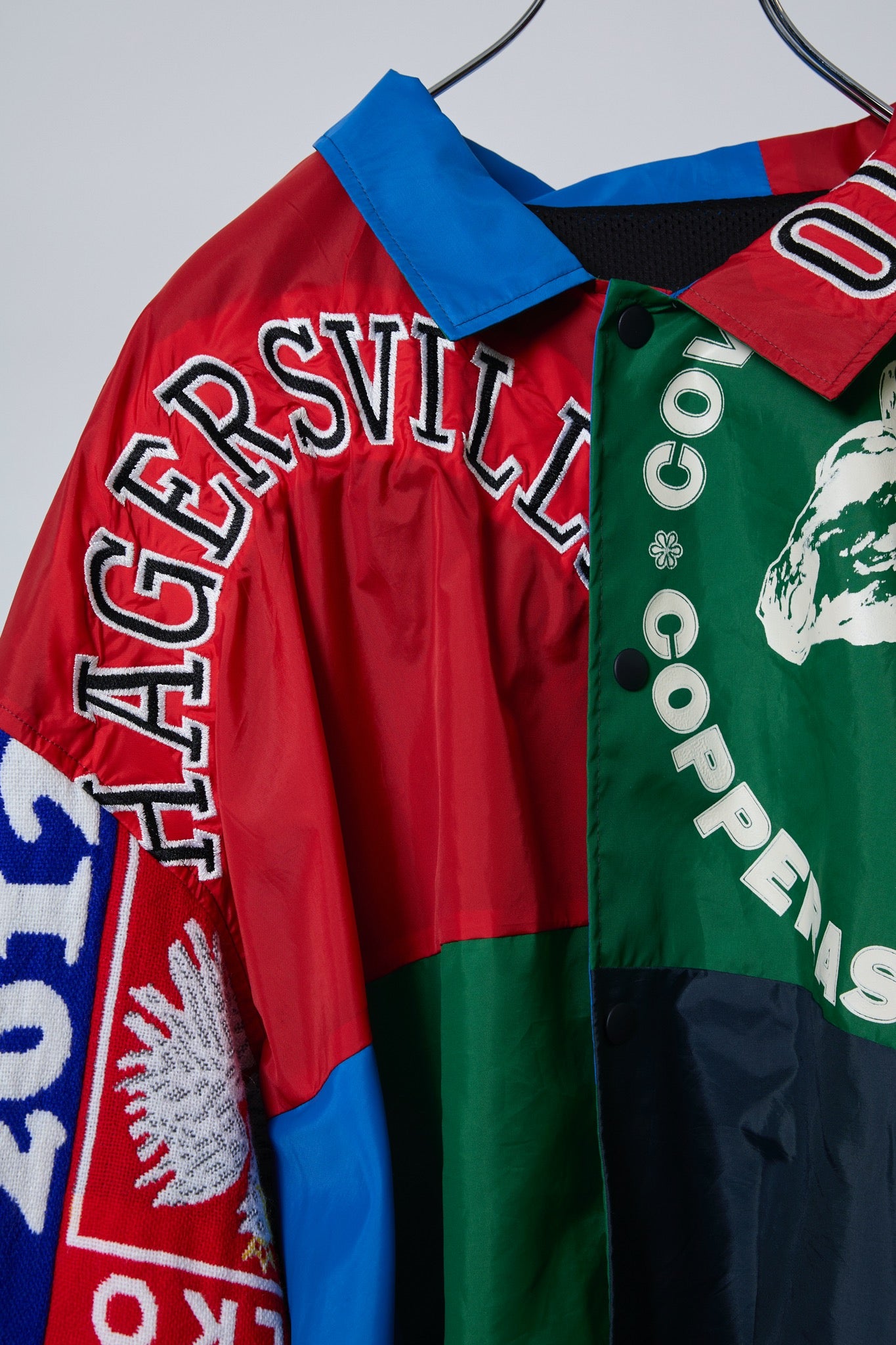 多数の古着コーチジャケット、スポーツジャケット、フーリガンマフラーを解体し、ランダムなカラーでパッチワークを施し、再構築したリメイクコーチジャケット。一点一点異なる古着の組み合わせが、唯一無二の表情を演出します。裏地にはメッシュ生地を使用し、軽やかな着心地を実現しました。スポーツMIXスタイルやストリートスタイルにぴったりの、主役級アウターです。※古着を使用しているため、稀に汚れやダメージがある場合がございます。予めご了承ください。