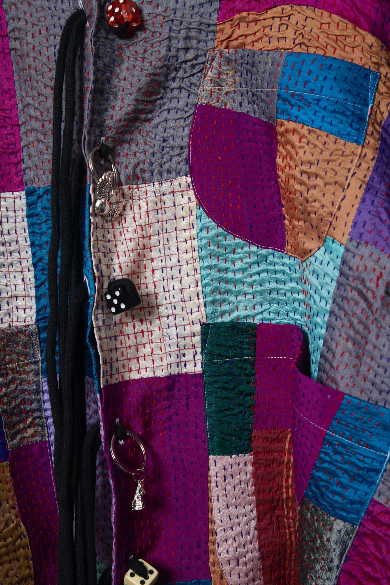 ベンガル地方の伝統的なカンタ刺繍を贅沢に使用した、唯一無二の存在感を放つアイテム。古くなった布を丁寧にパッチワークし、刺し子刺繍を施して新たな布へと蘇らせたカンタを前身頃にあしらい、廃棄を減らし、資源を大切にするサステナブルな魅力をプラス。後ろ身頃と袖には、パッチワークされたキルティング生地を使用し、温かみのある表情に仕上げました。