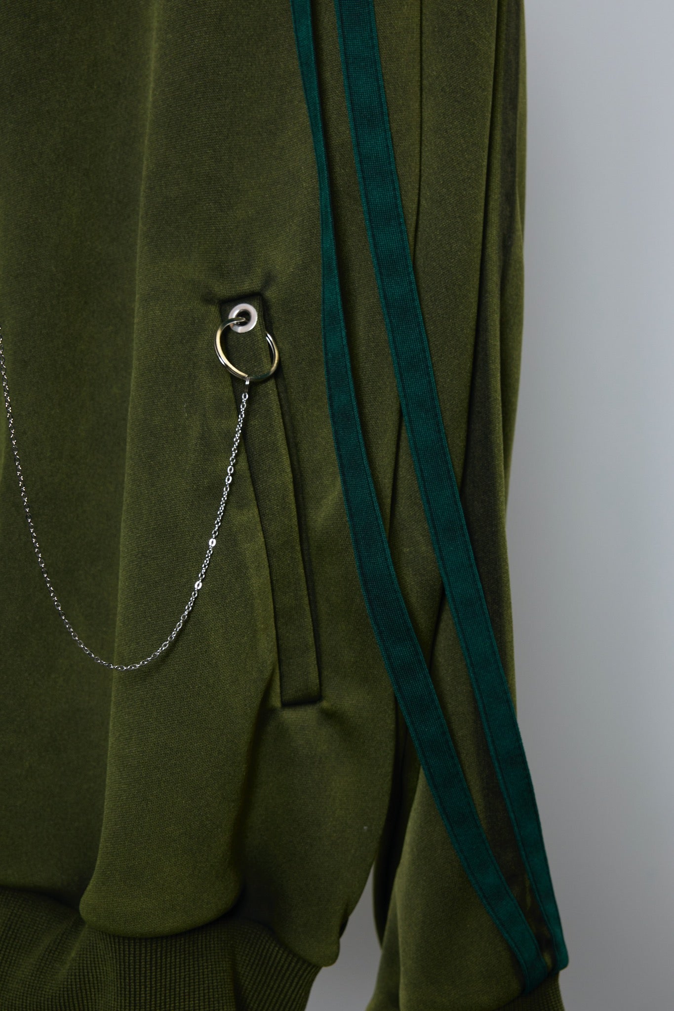 顔料を使用した後染め加工による、独特な風合いのトラックジャケット。ランダムに付属するチェーンパーツとチャームが、個性的なアクセントをプラスします。※こちらは職人が手作業で染色しているため、染料の飛び散りや色むらが生じる場合がございます。手作業ならではの風合いとして、ご理解いただけますと幸いです。