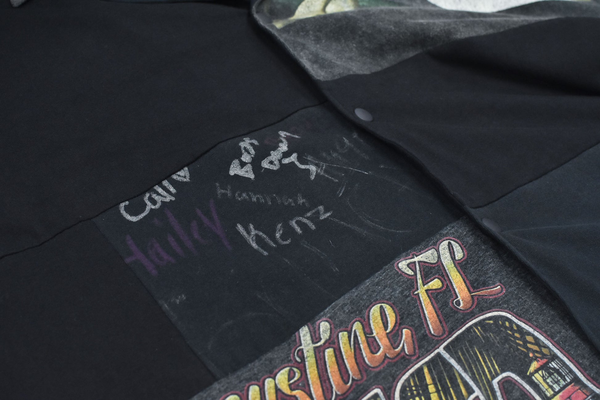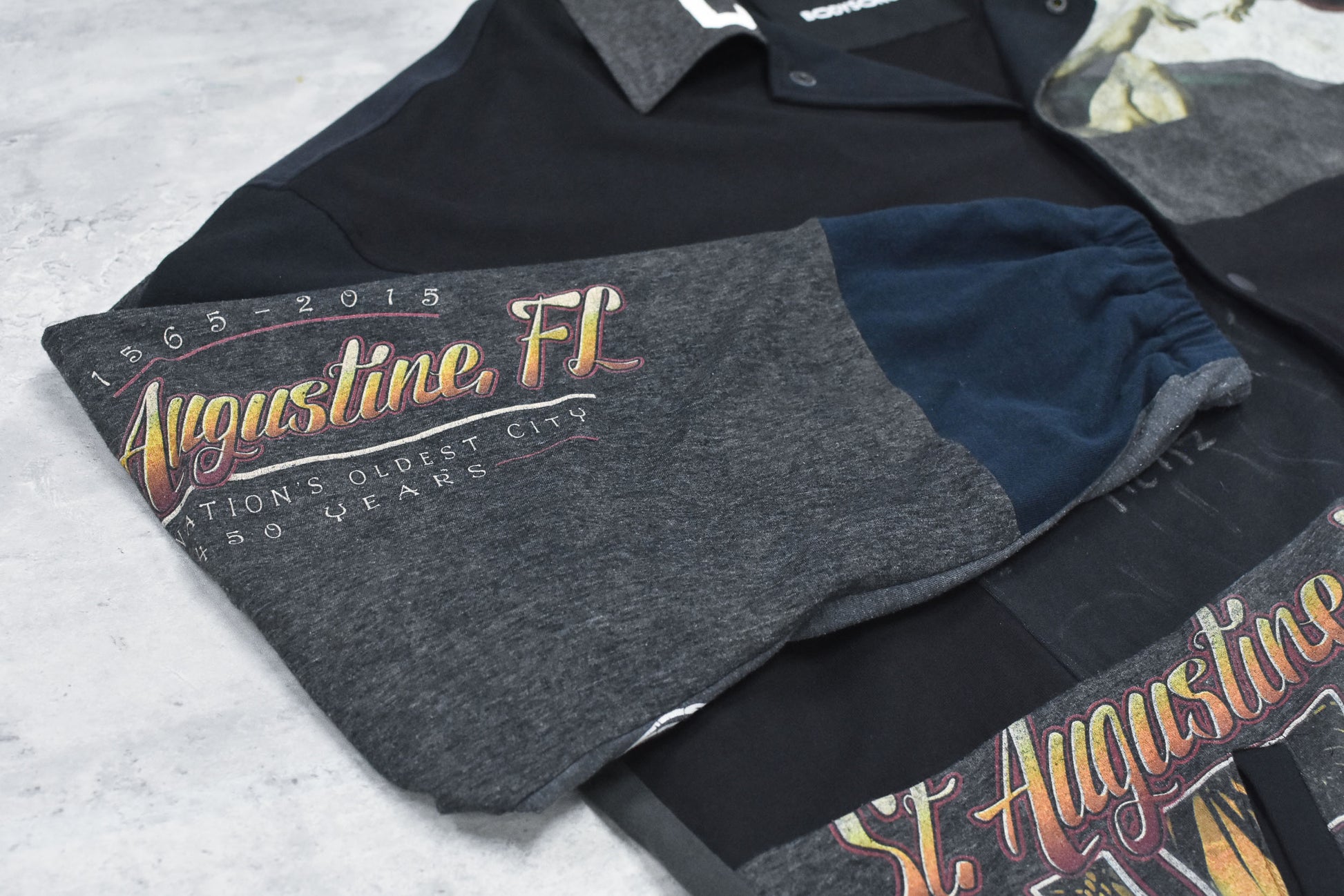 多数の古着Tシャツを解体し、パッチワークで再構築したアップサイクルコーチジャケット。ランダムに配置された古着Tシャツが、一点一点異なる表情を演出します。裏地にはメッシュ生地を使用し、軽やかな着心地を実現しました。カジュアルスタイルに遊び心をプラスする、こだわりの詰まった一着です。※古着を使用しているため、稀に汚れやダメージがある場合がございます。予めご了承ください。