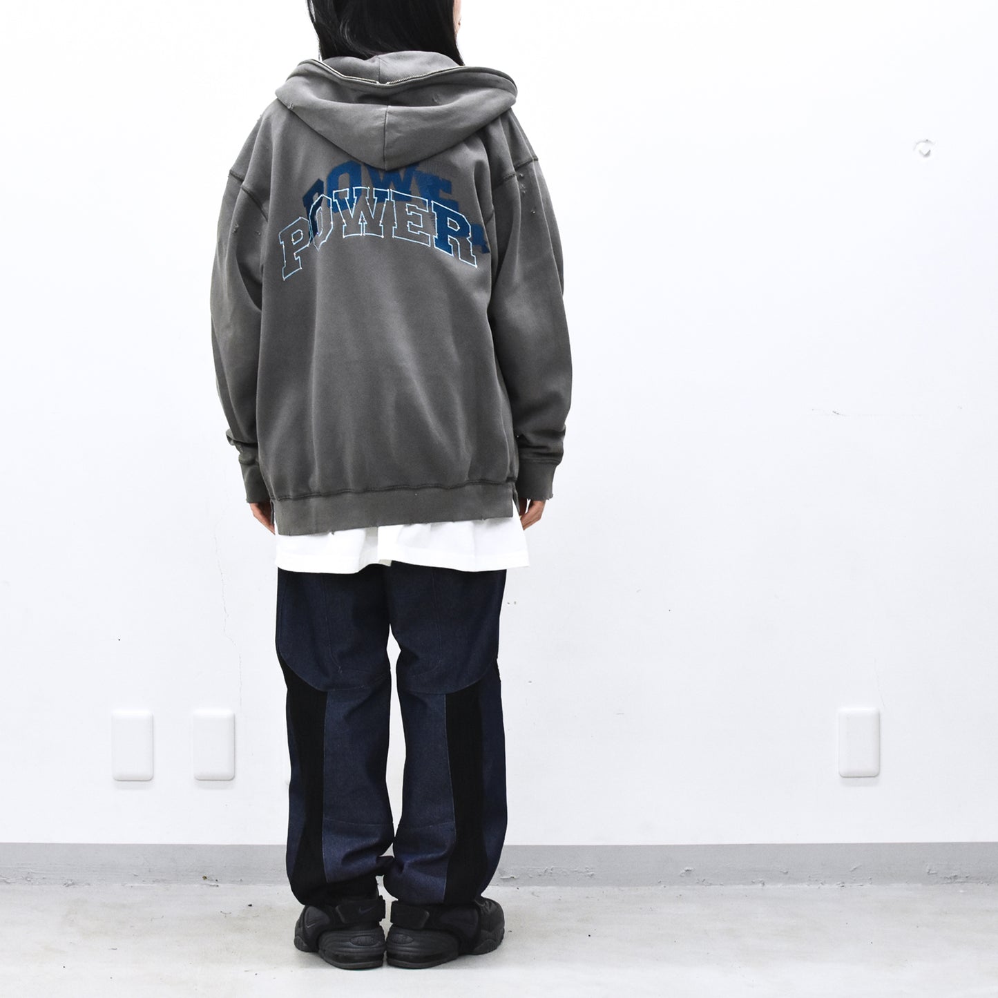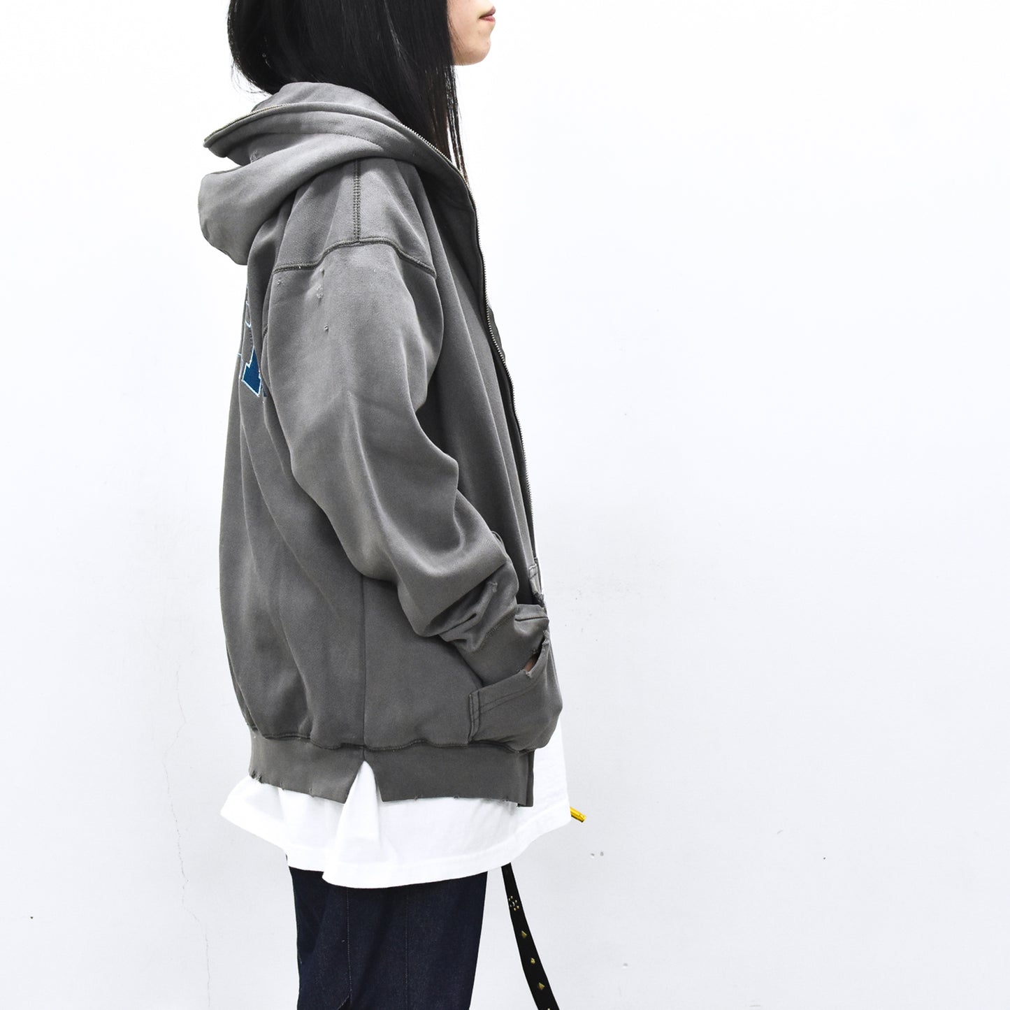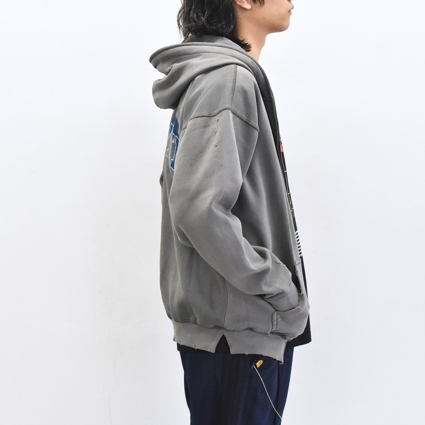 現代アーティストNUKEMEとのコラボレーションによるグリッチ刺繍のフーディ。