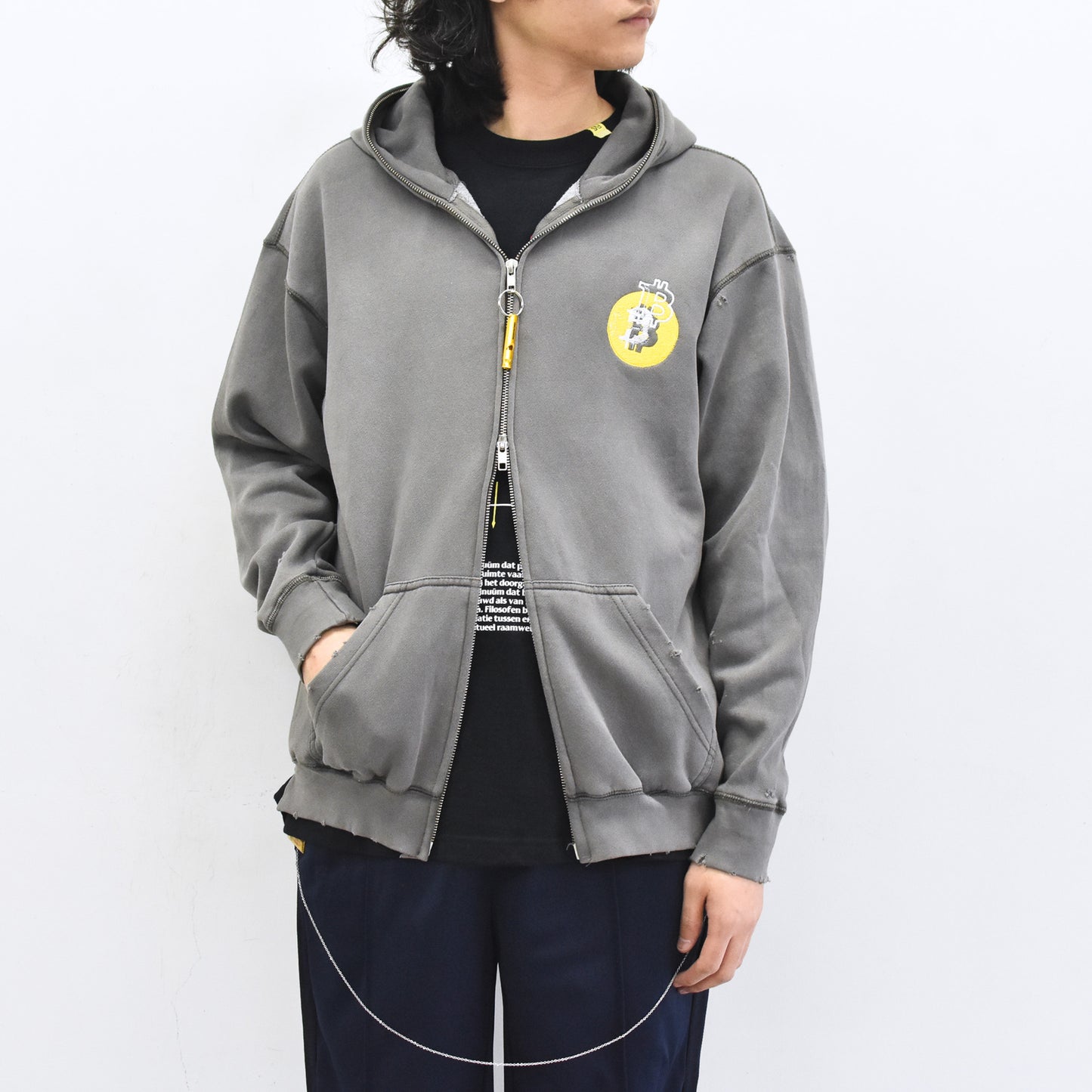 BODYSONG. / GLITCH EMBROIDERY DISTRESSED HOODIE/BTC - BLACK