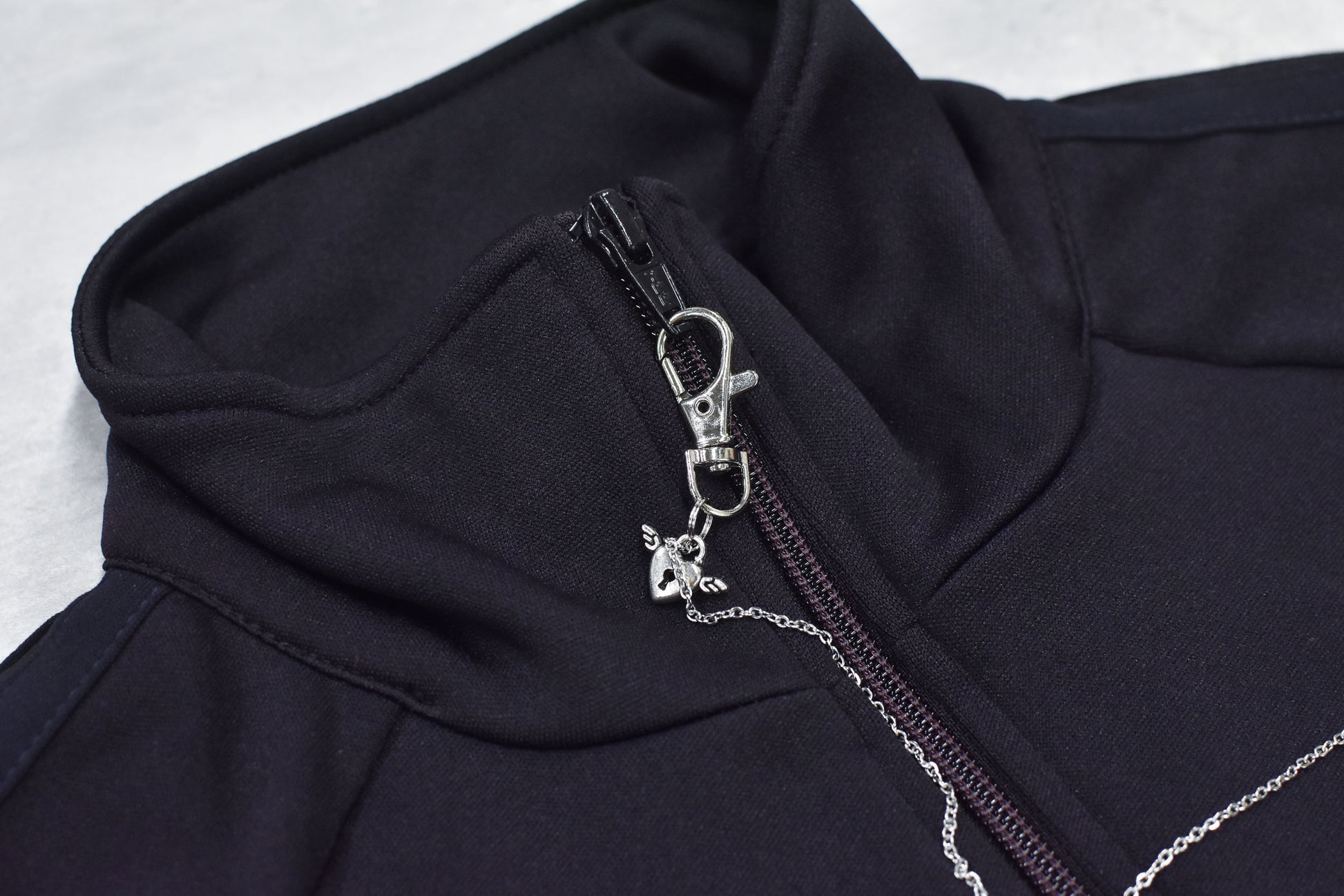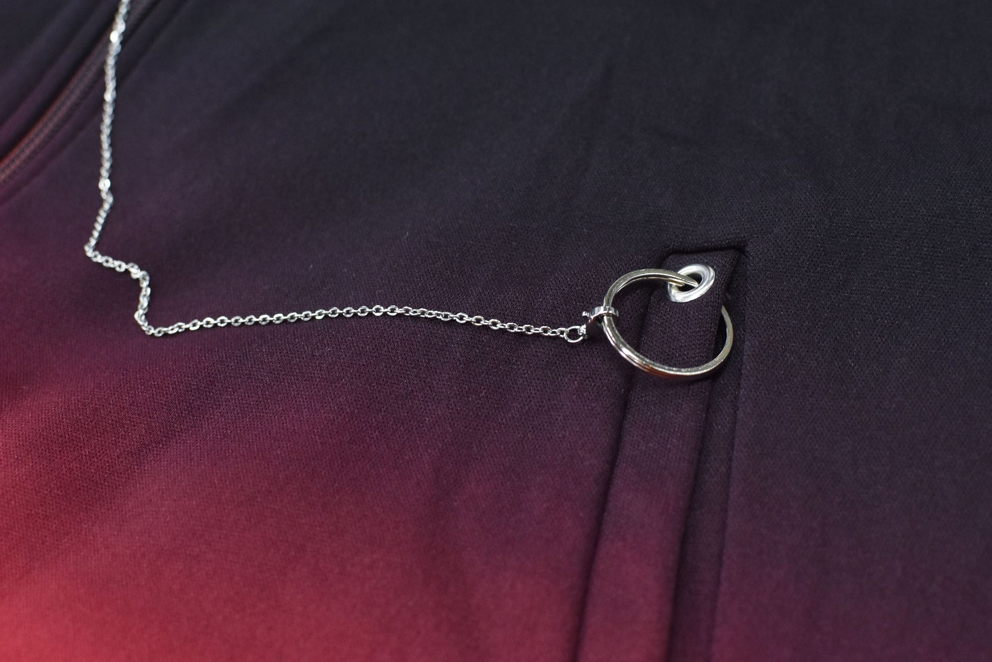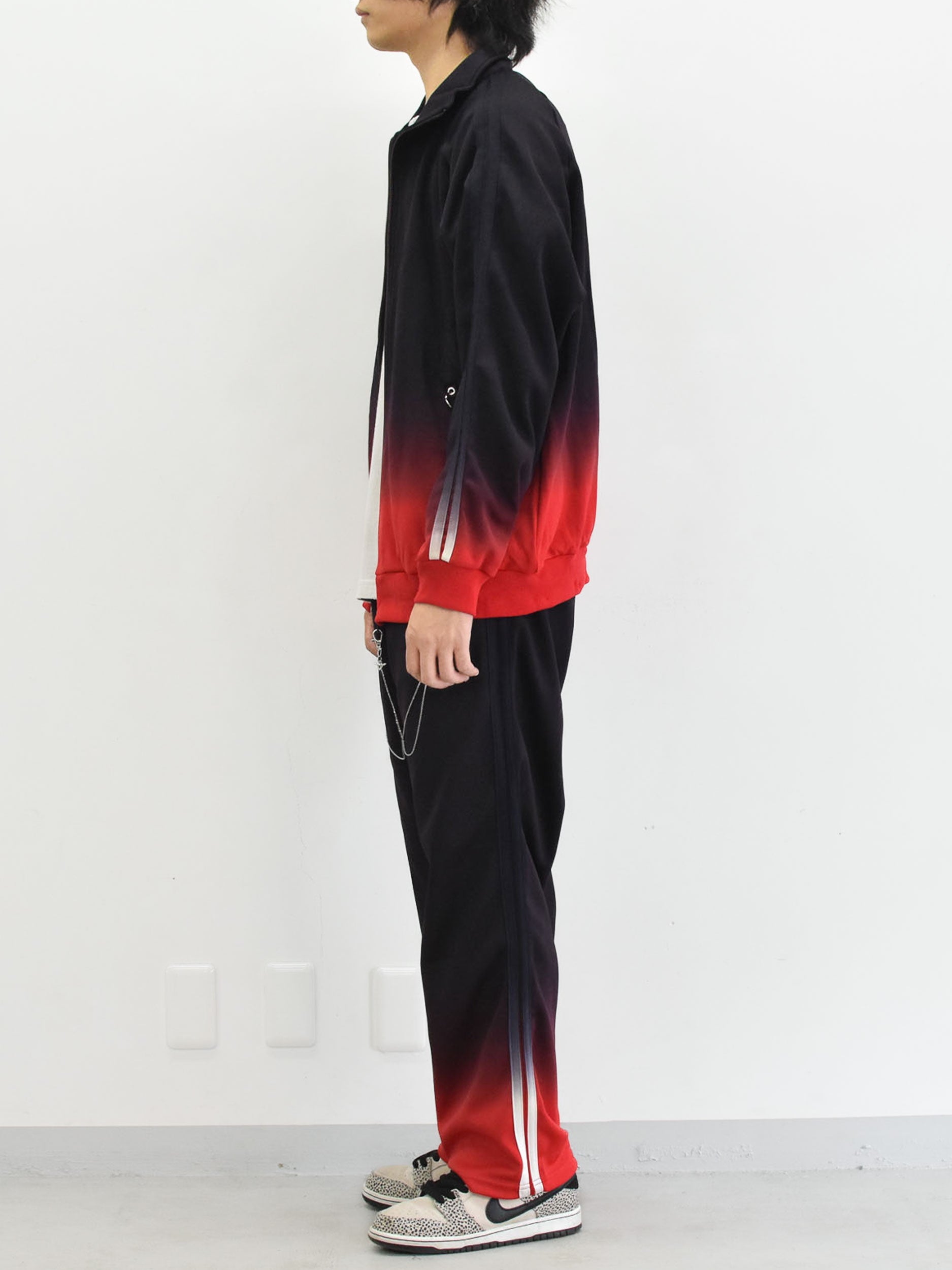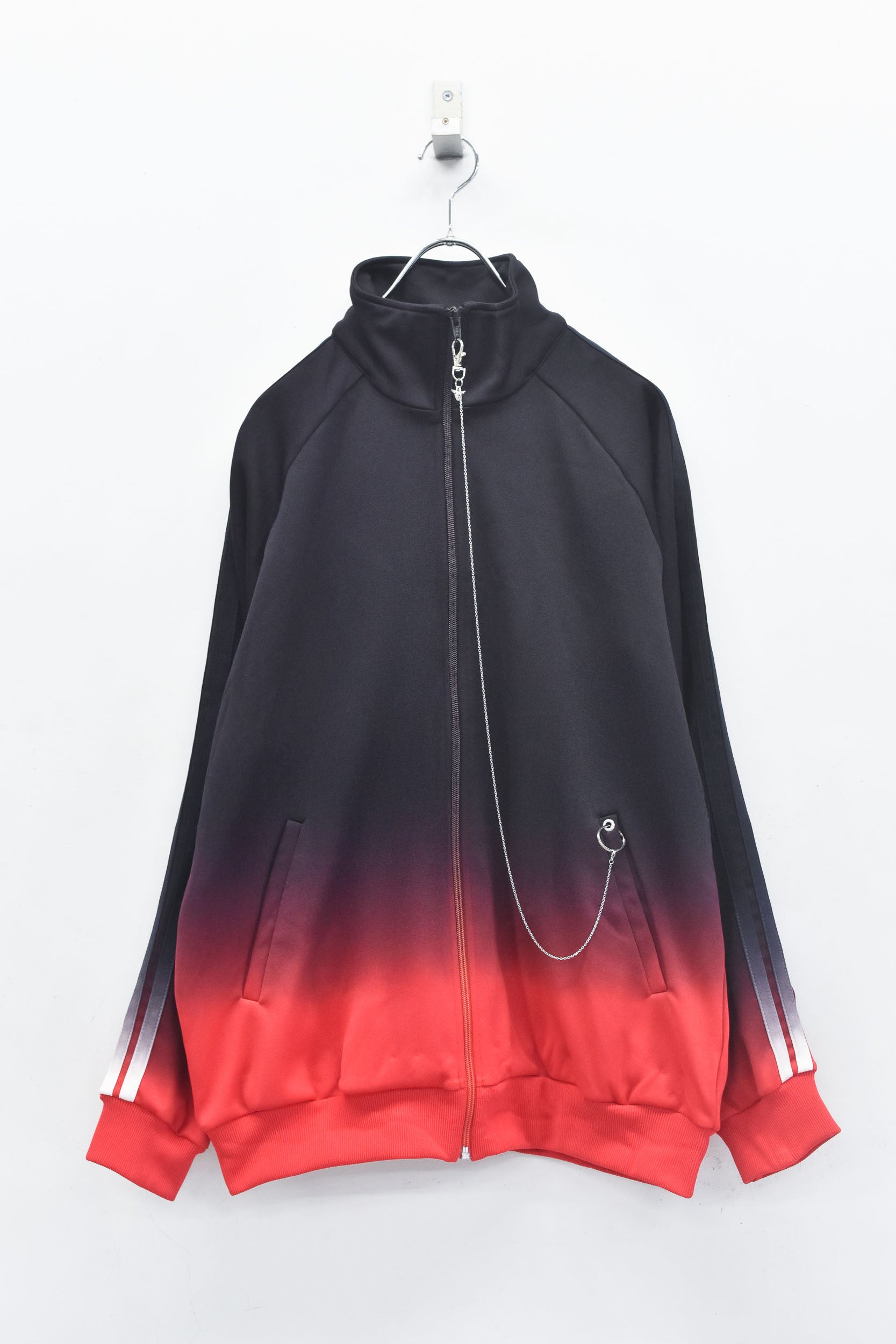 美しいグラデーション染めが特徴のトラックジャケット。ランダムに付属するチェーンパーツとチャームが、さりげないアクセントをプラスします。※こちらは職人が手作業で染色しているため、染料の飛び散りや、色の境界線に多少の色むらが生じる場合がございます。手作業ならではの風合いとして、ご理解いただけますと幸いです。
