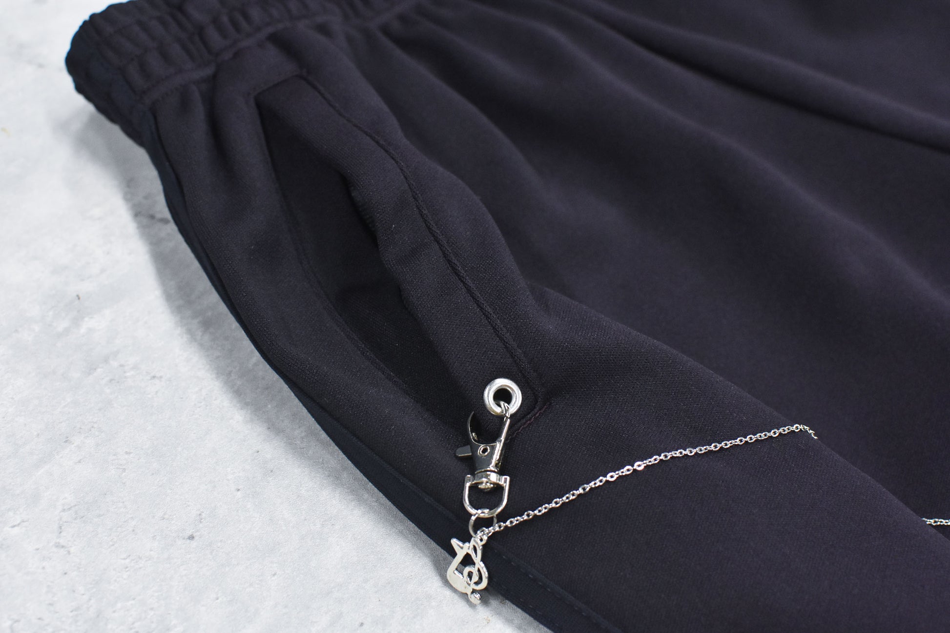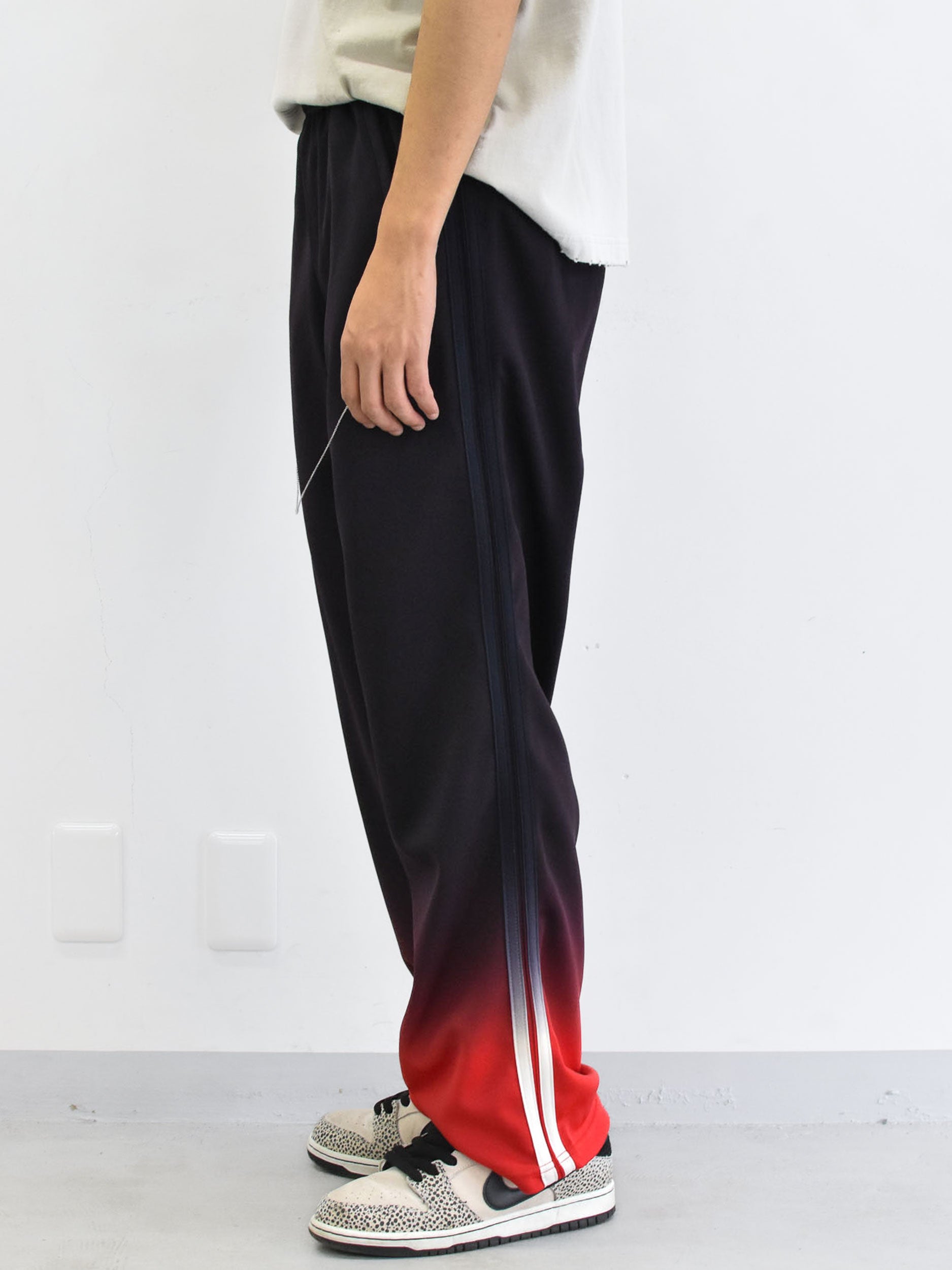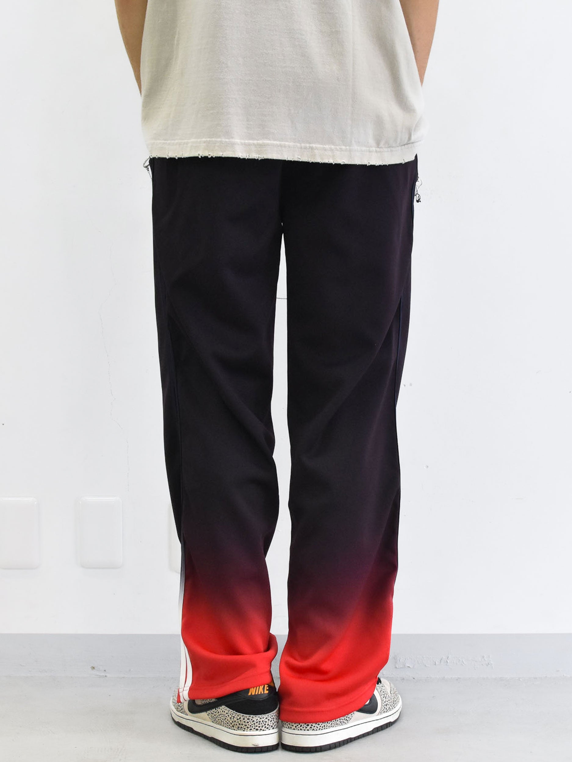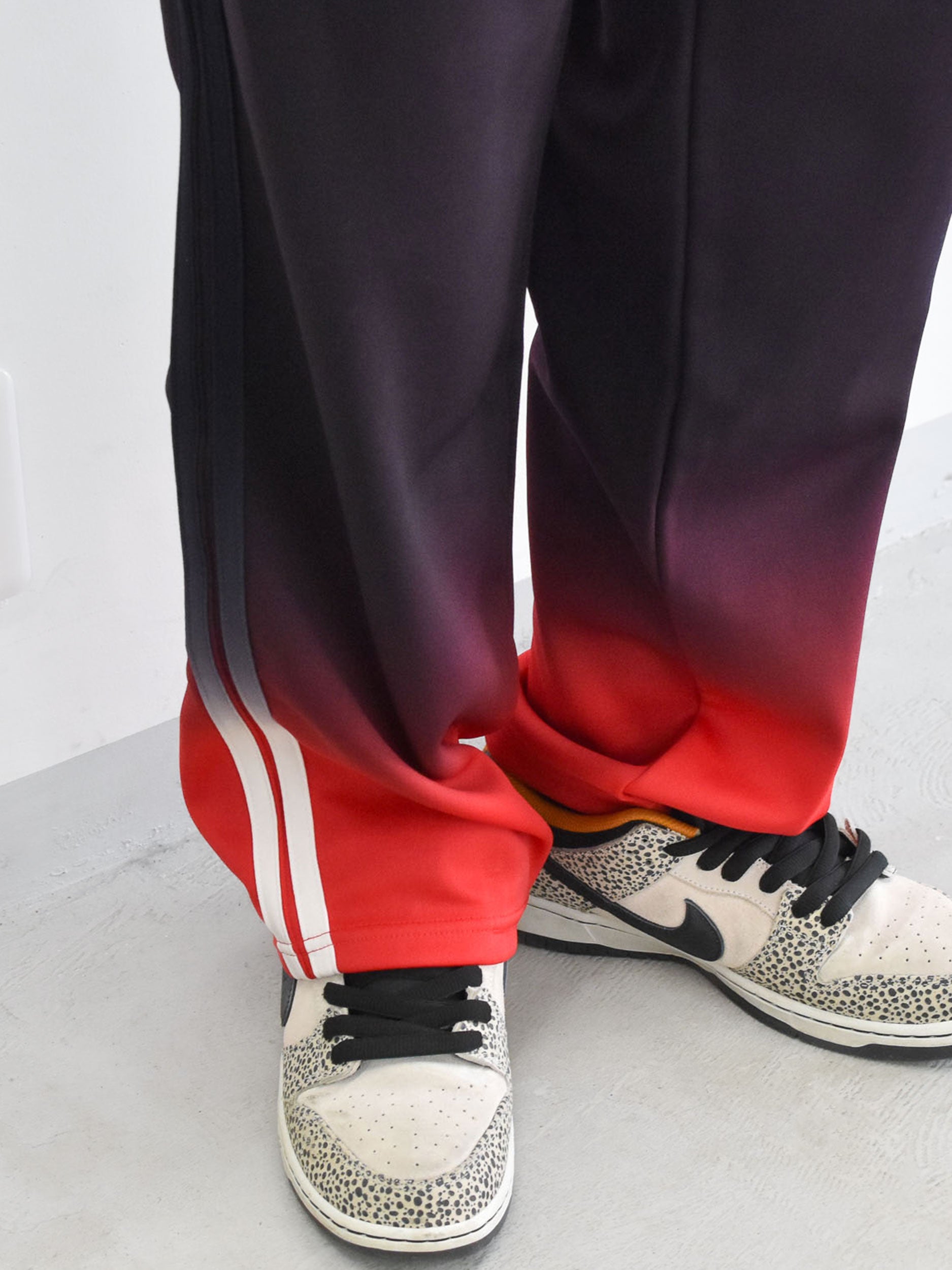 美しいグラデーション染めが目を引くトラックパンツ。ランダムに付属するチェーンパーツとチャームが、さりげないアクセントをプラスします。※こちらは職人が手作業で染色しているため、染料の飛び散りや、色の境界線に多少の色むらが生じる場合がございます。手作業ならではの風合いとして、ご理解いただけますと幸いです。カジュアルながらも、洗練された印象を与える、個性的な一本です。