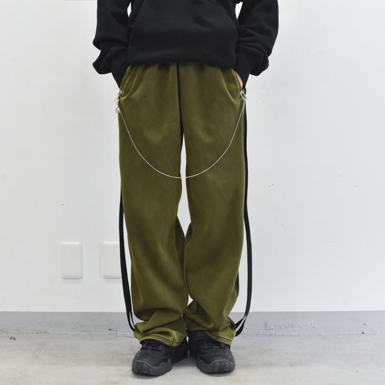 顔料を使用した後染め加工による、独特な風合いが魅力のトラックパンツ。