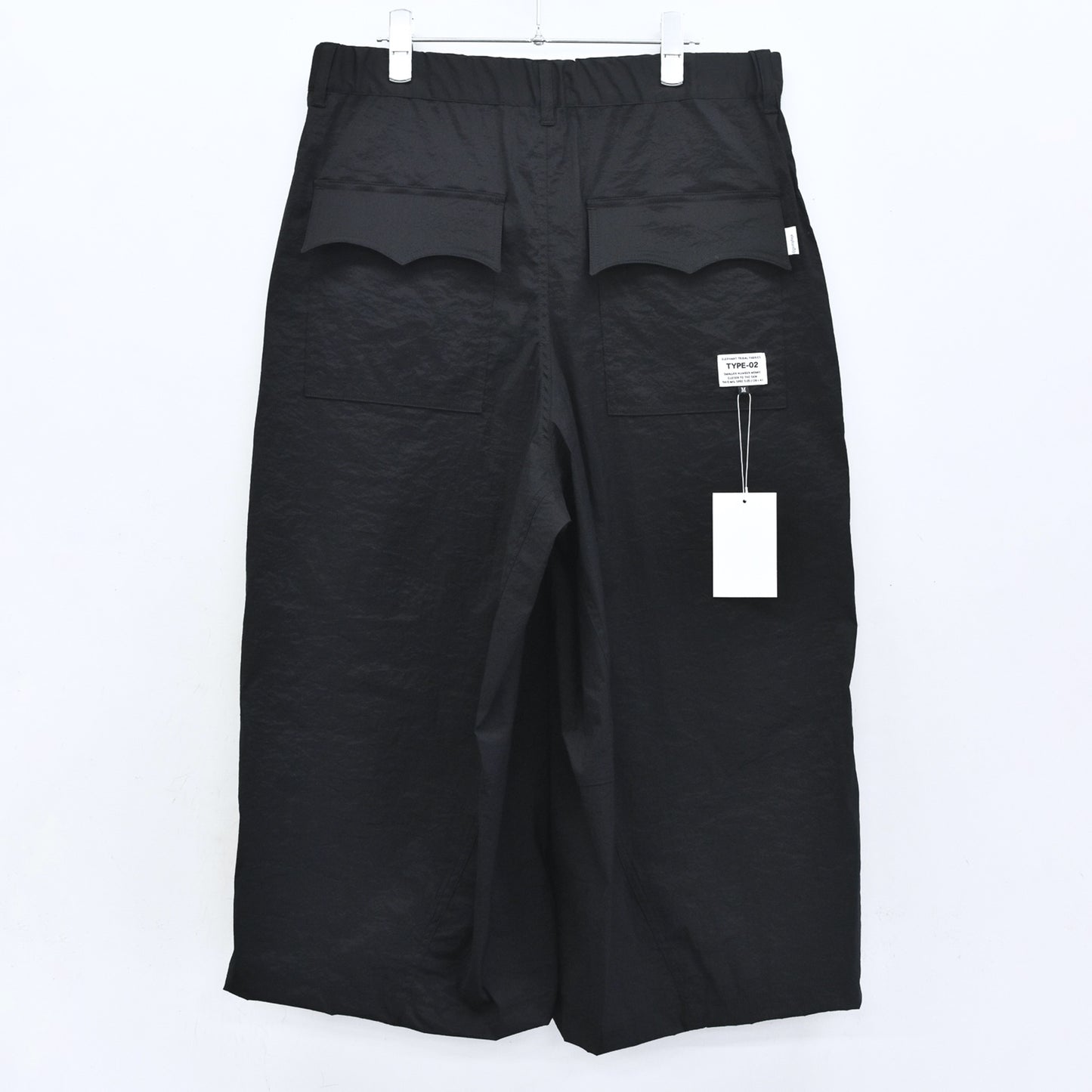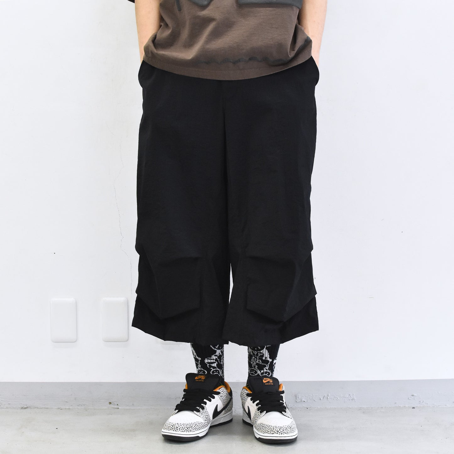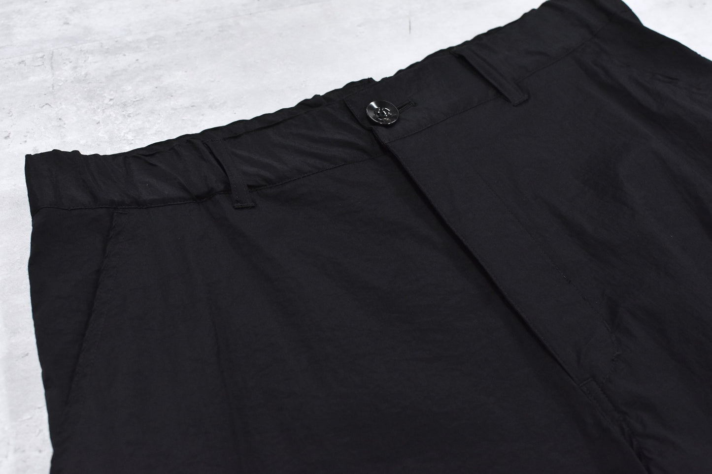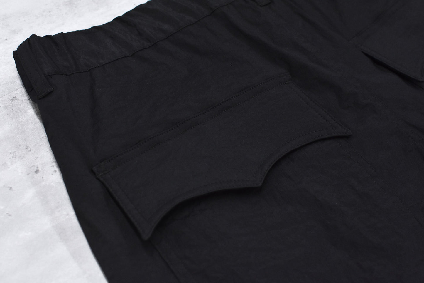 股部分には運動量を上げる為、クライミングパンツに用いられるディティールをプラス。ウエストは平ゴム、スピンドルを配置したイージーパンツ仕様。