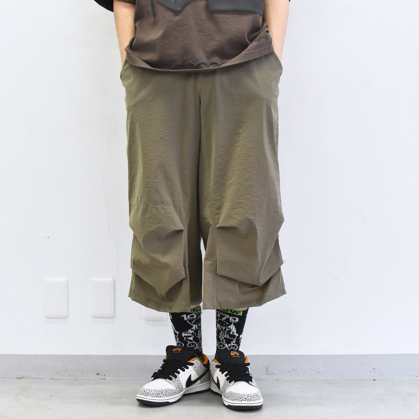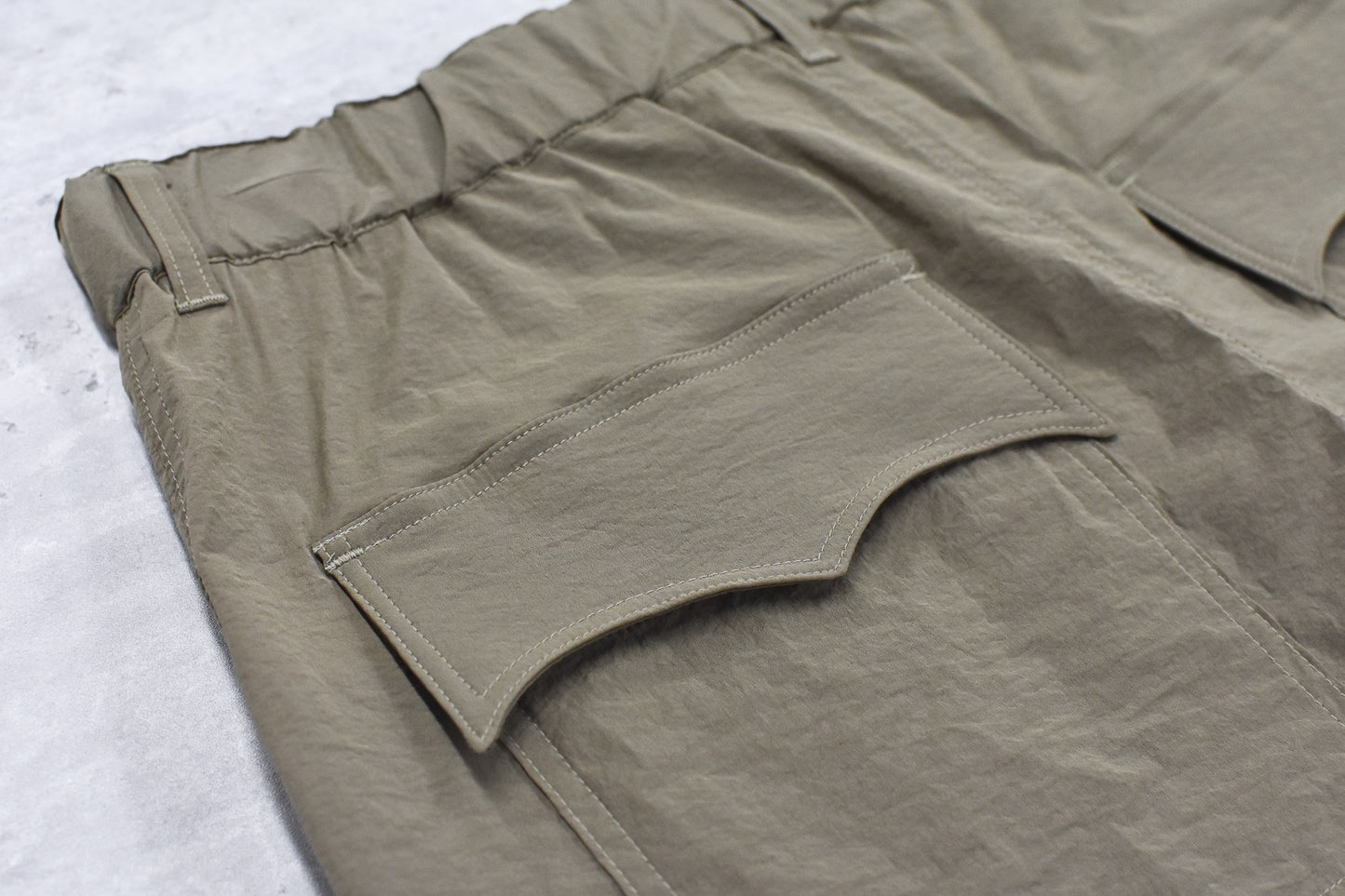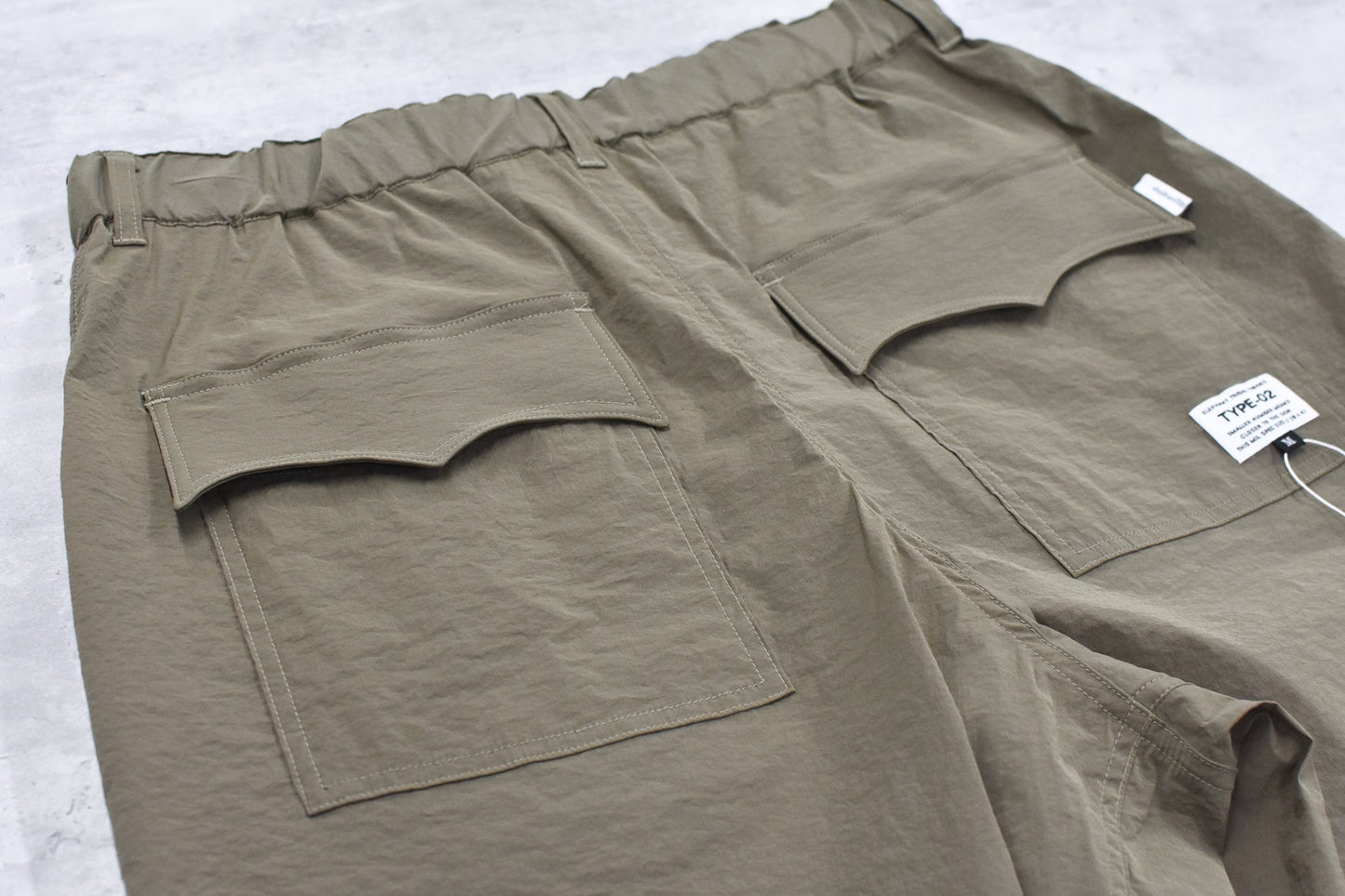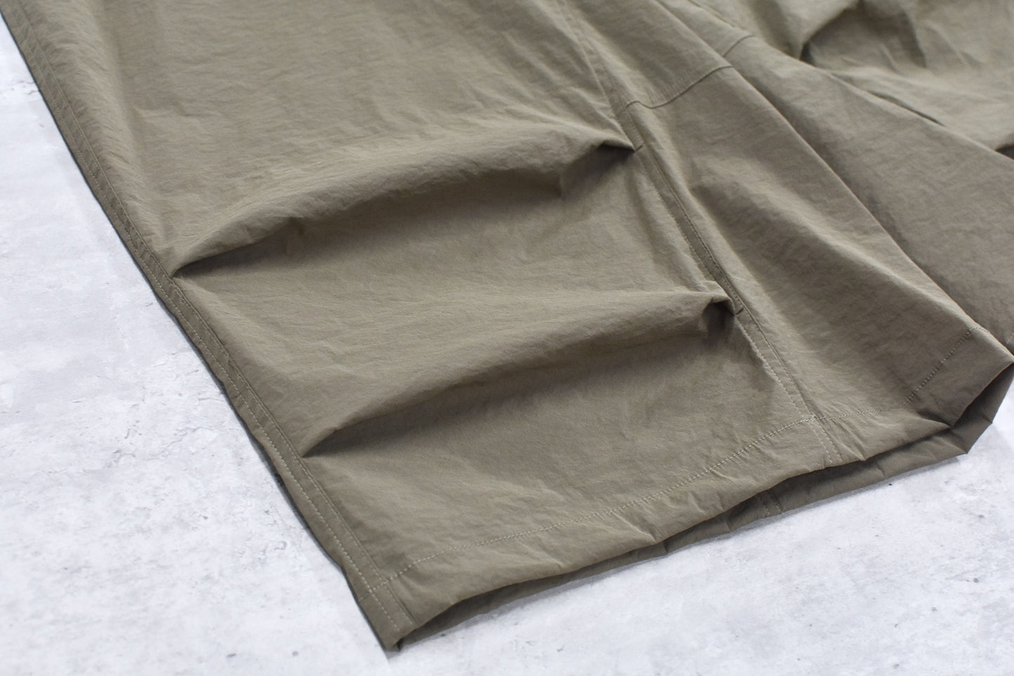 股部分には運動量を上げる為、クライミングパンツに用いられるディティールをプラス。ウエストは平ゴム、スピンドルを配置したイージーパンツ仕様。