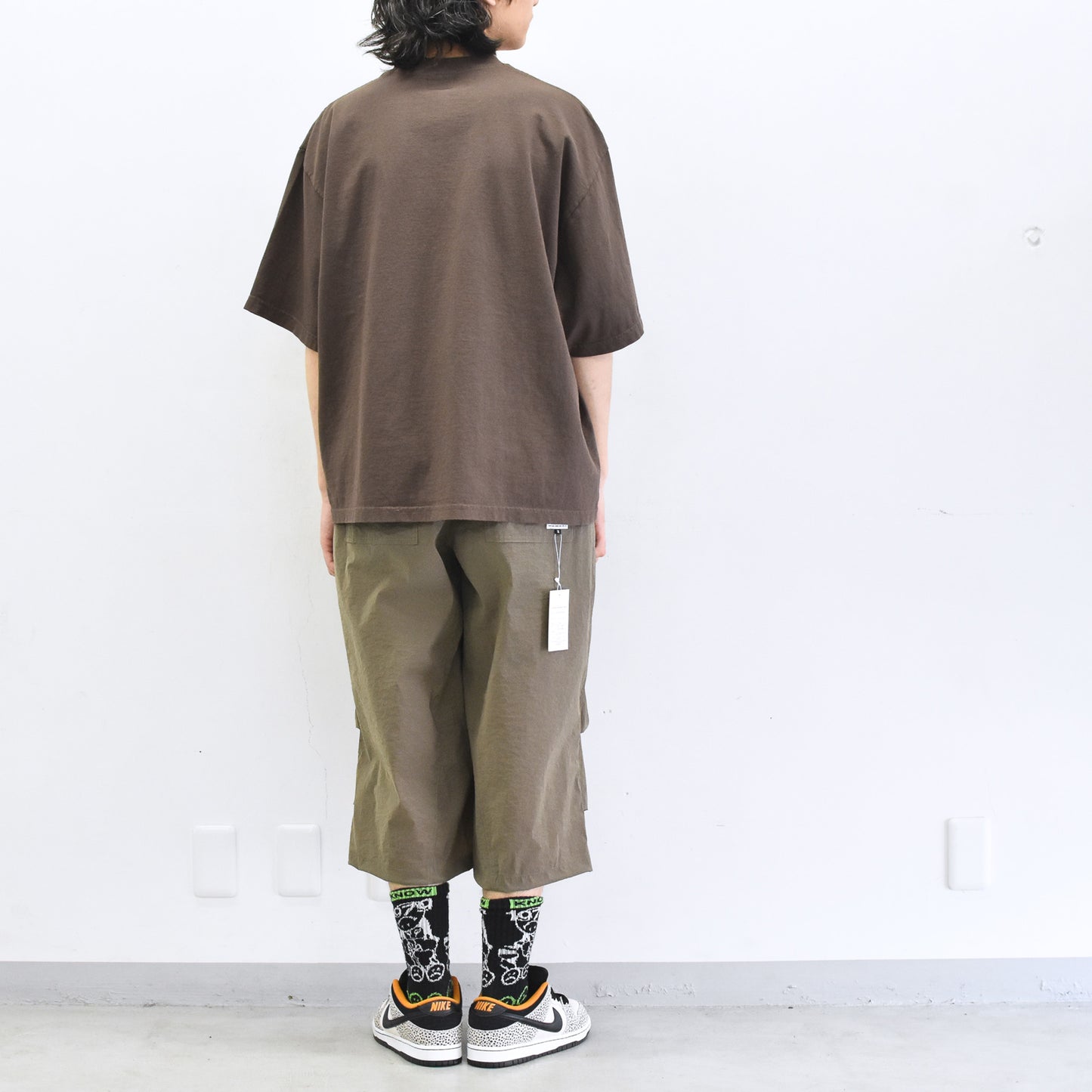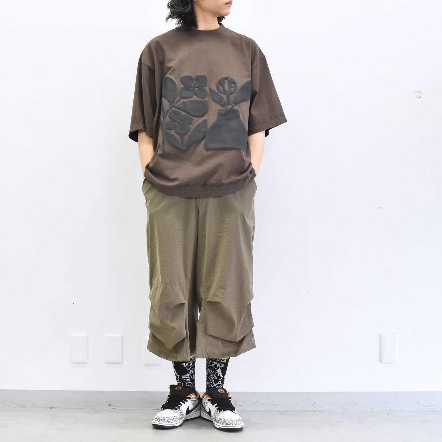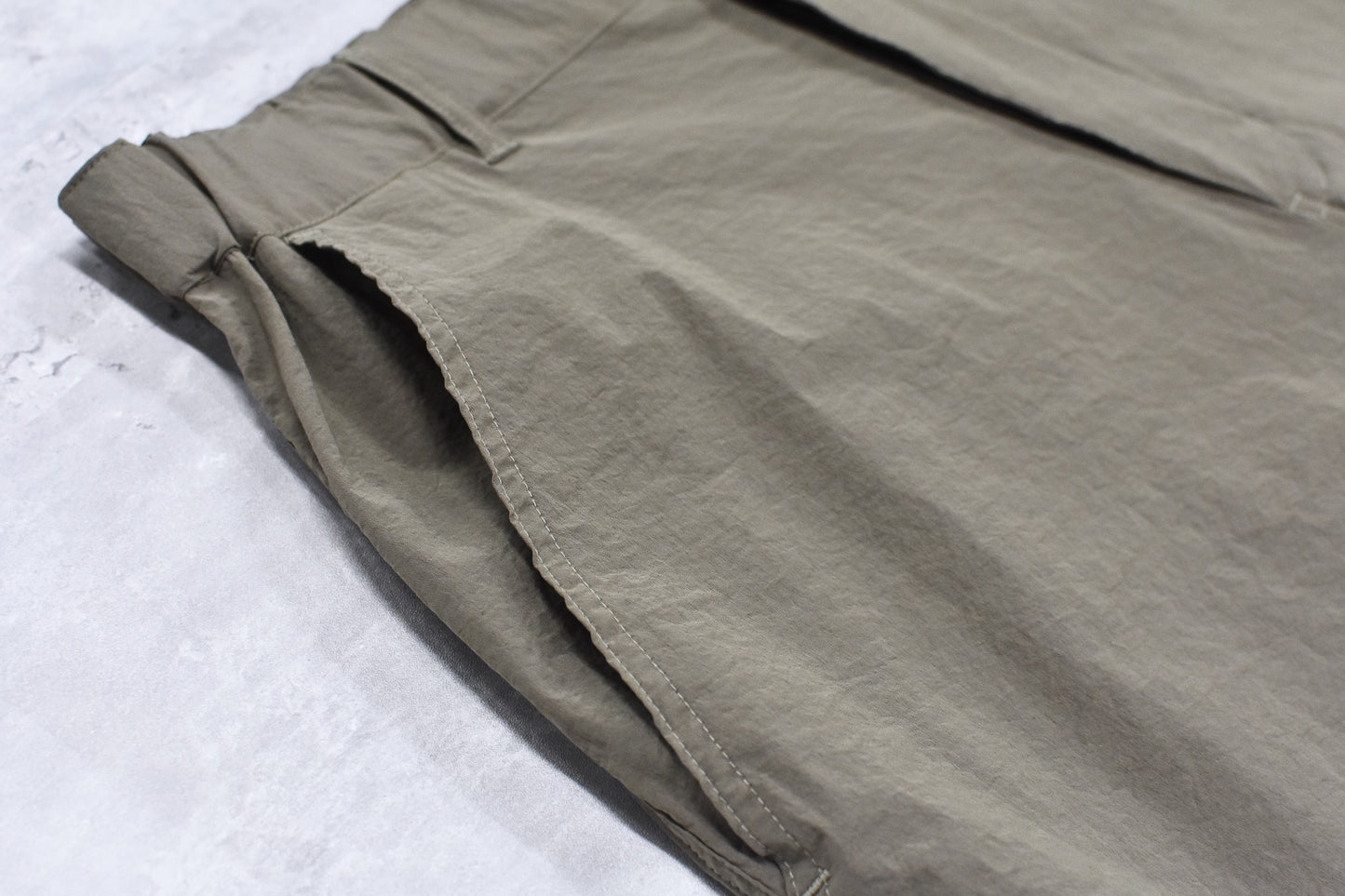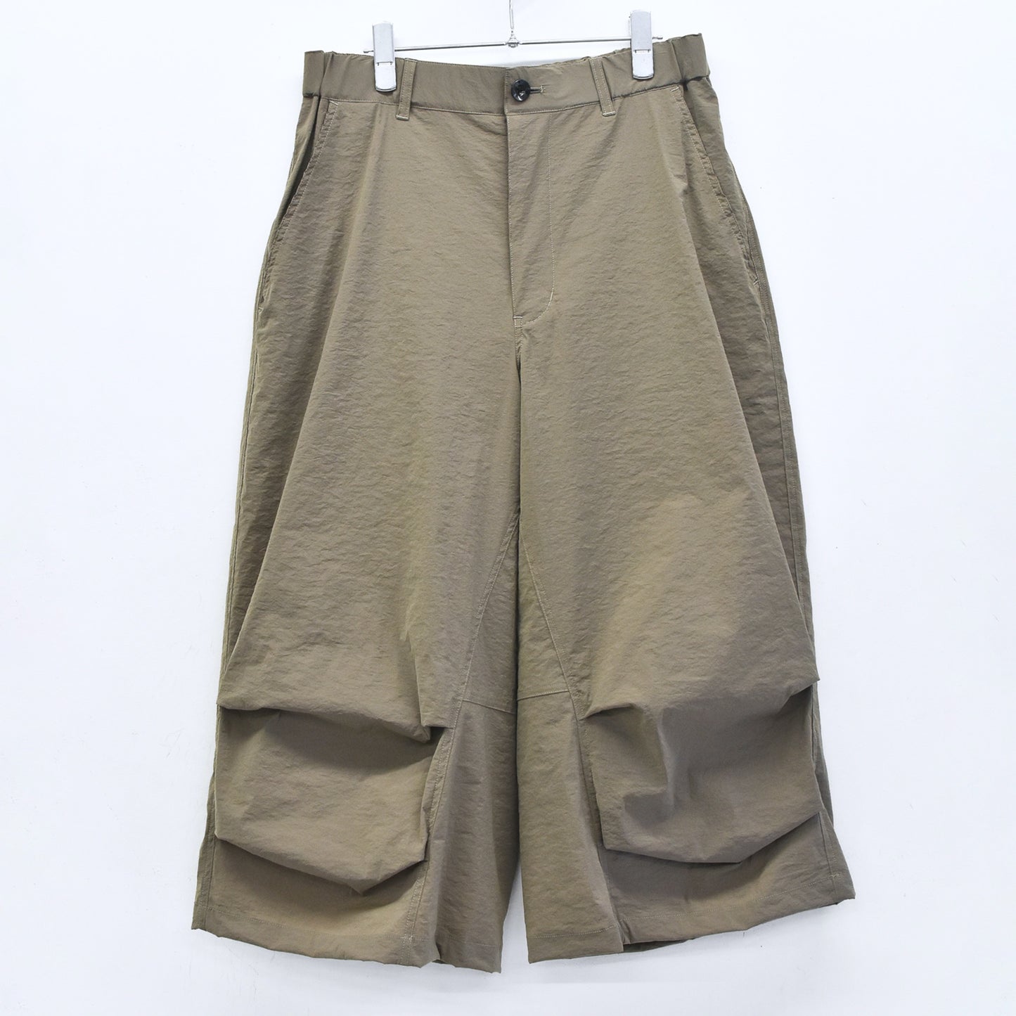 股部分には運動量を上げる為、クライミングパンツに用いられるディティールをプラス。ウエストは平ゴム、スピンドルを配置したイージーパンツ仕様。
