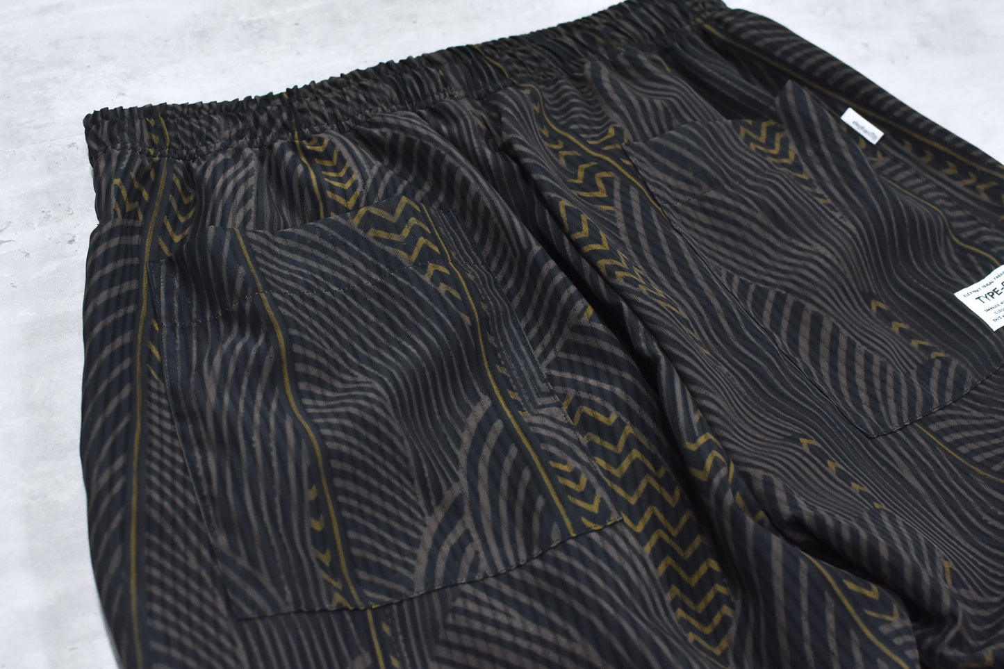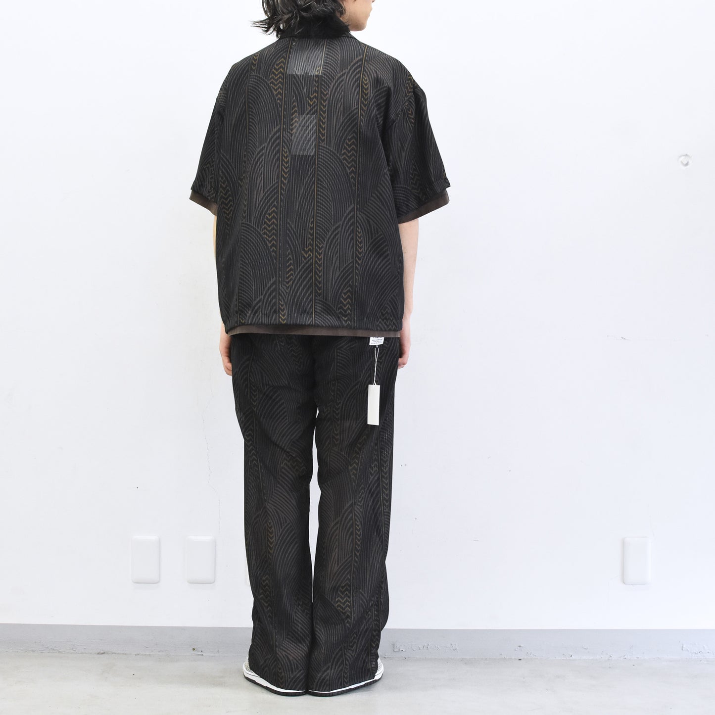 根をイメージしたオリジナルテキスタイルを使用した透け感のあるフレアシルエットのイージーパンツ。