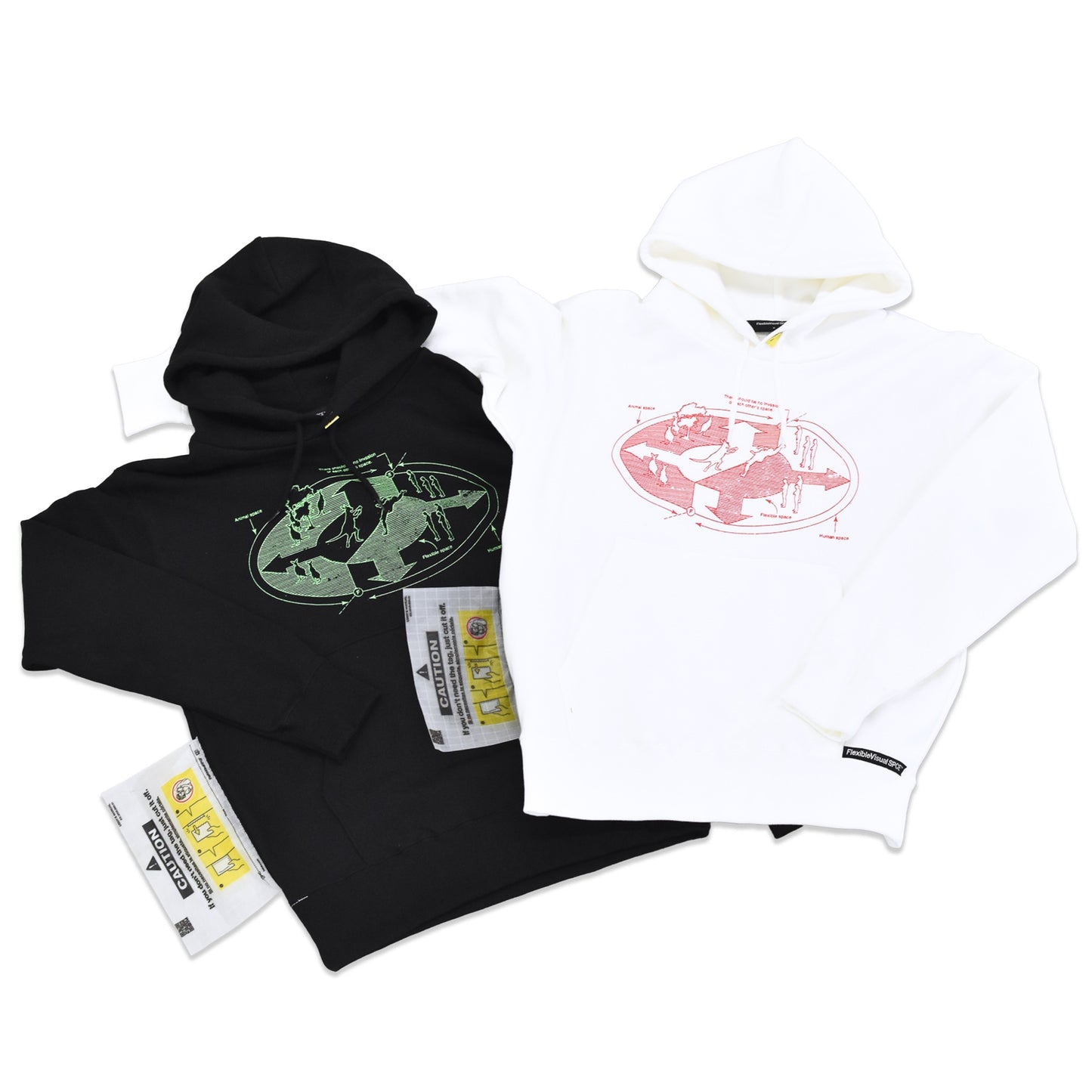 身頃脇のCAUTIONタグは半透明のリップストップ生地を使用。