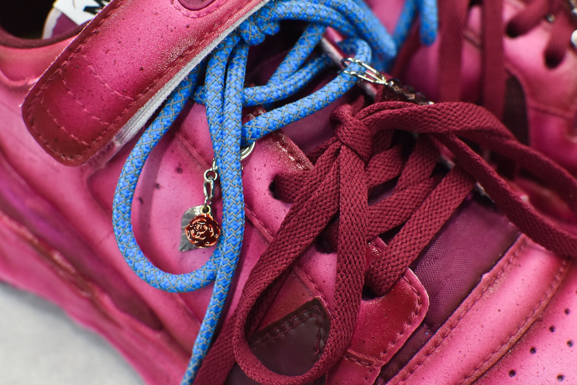 エナメルやエコレザーで作成したのちに薔薇の花をイメージし、大胆に全体にエアブラシで吹いて仕上げました。