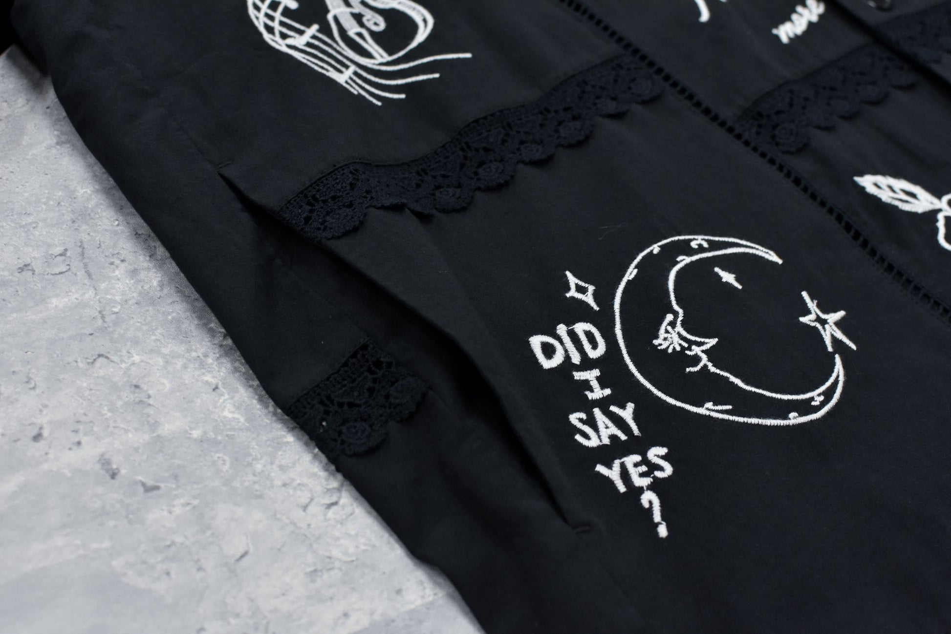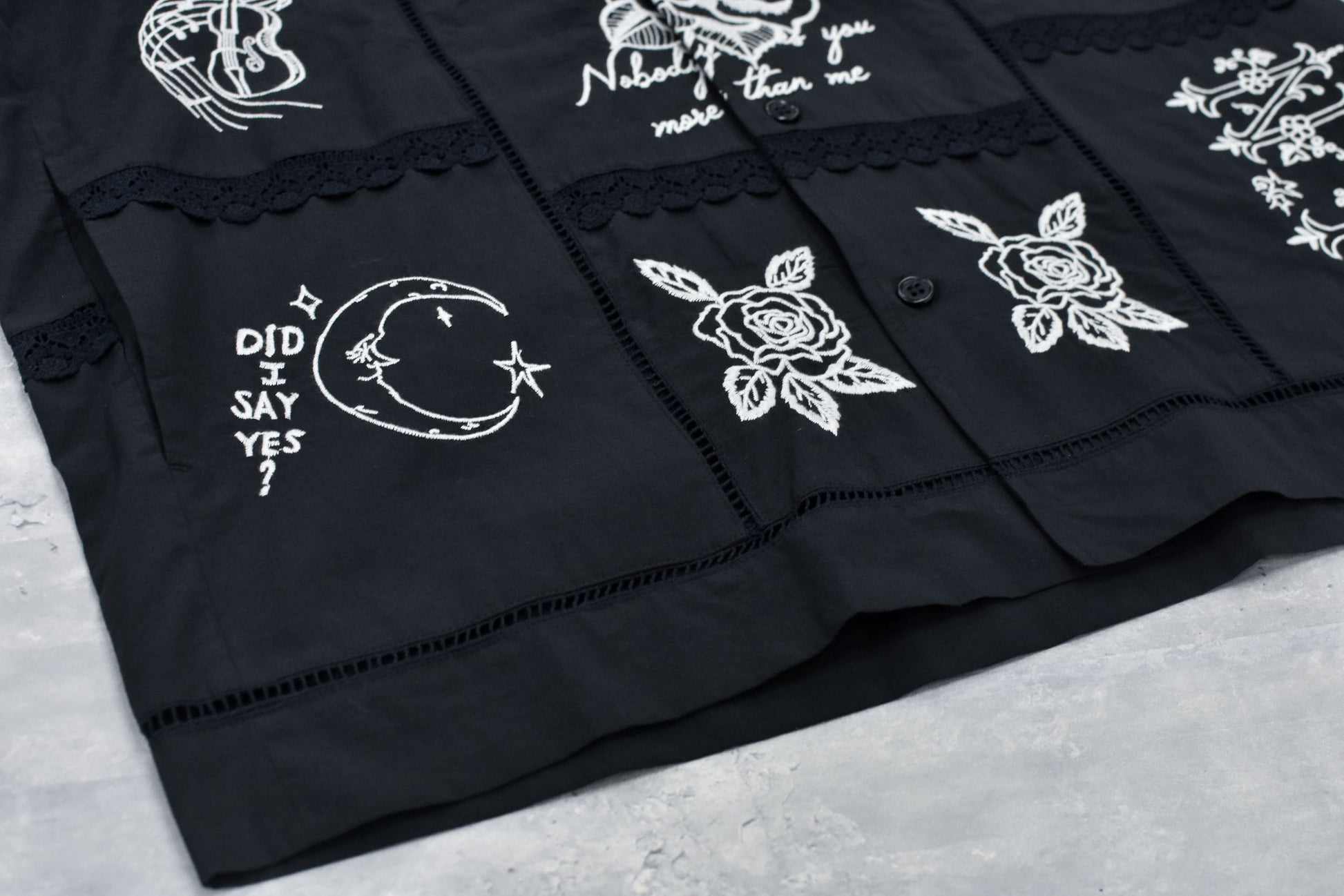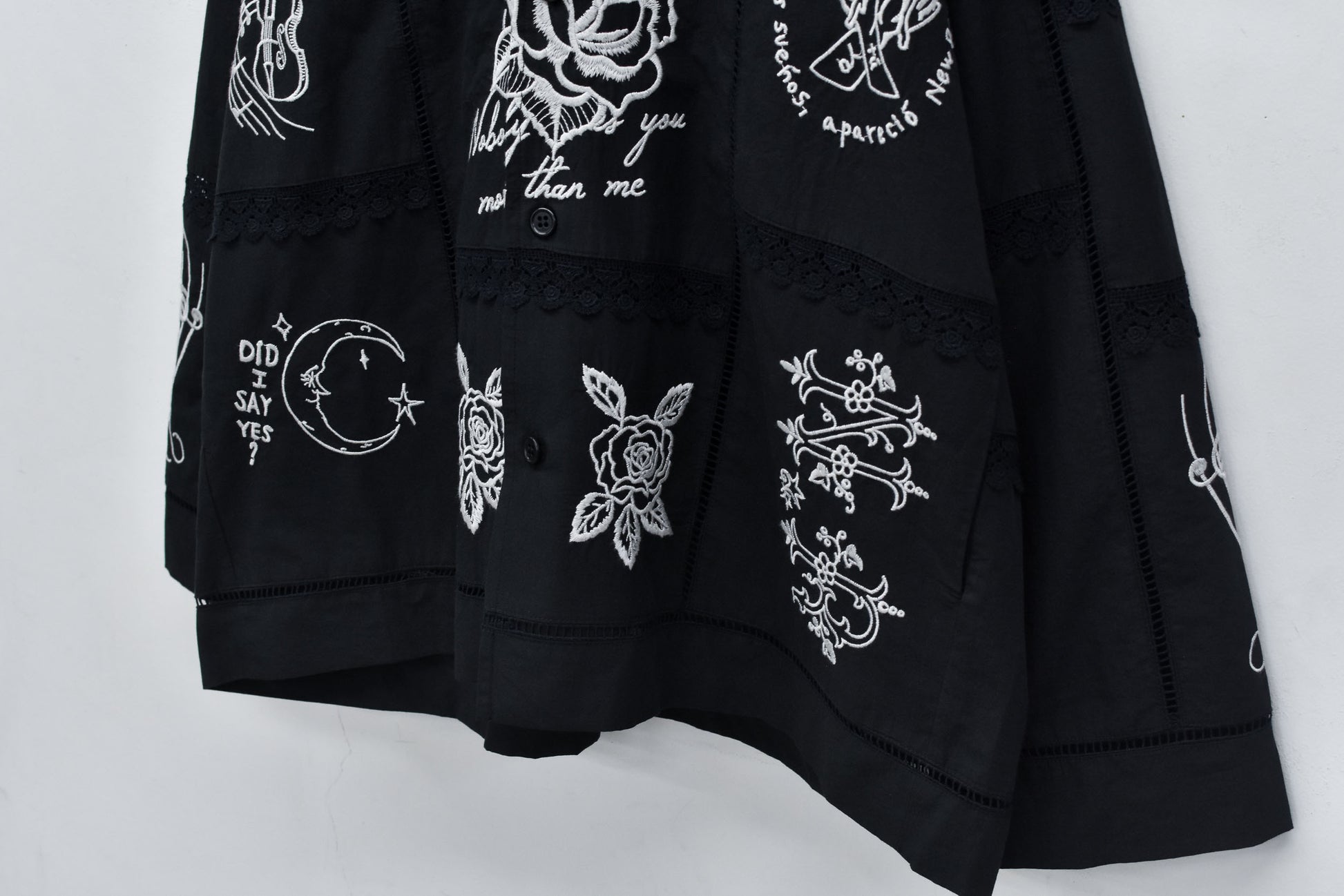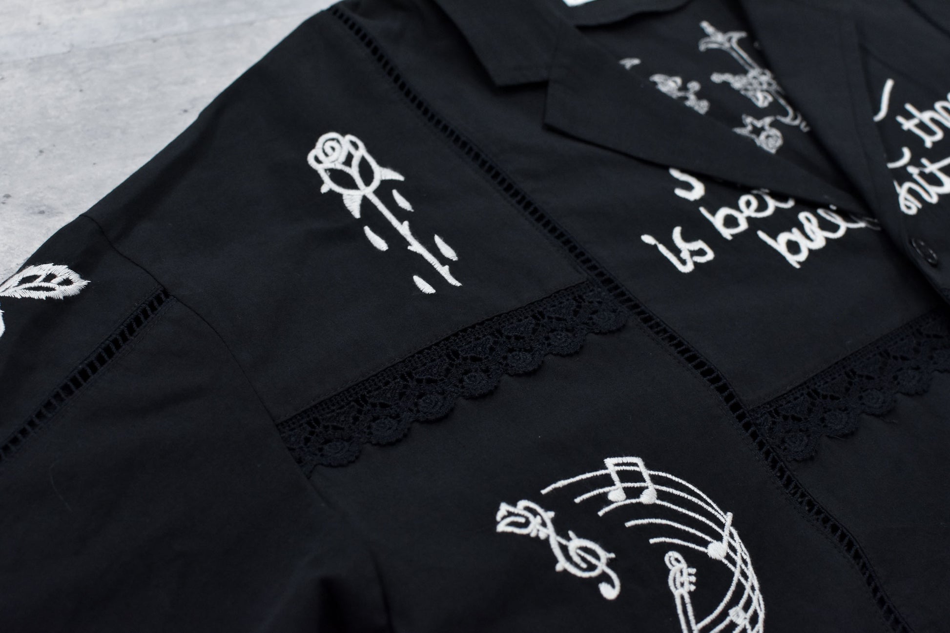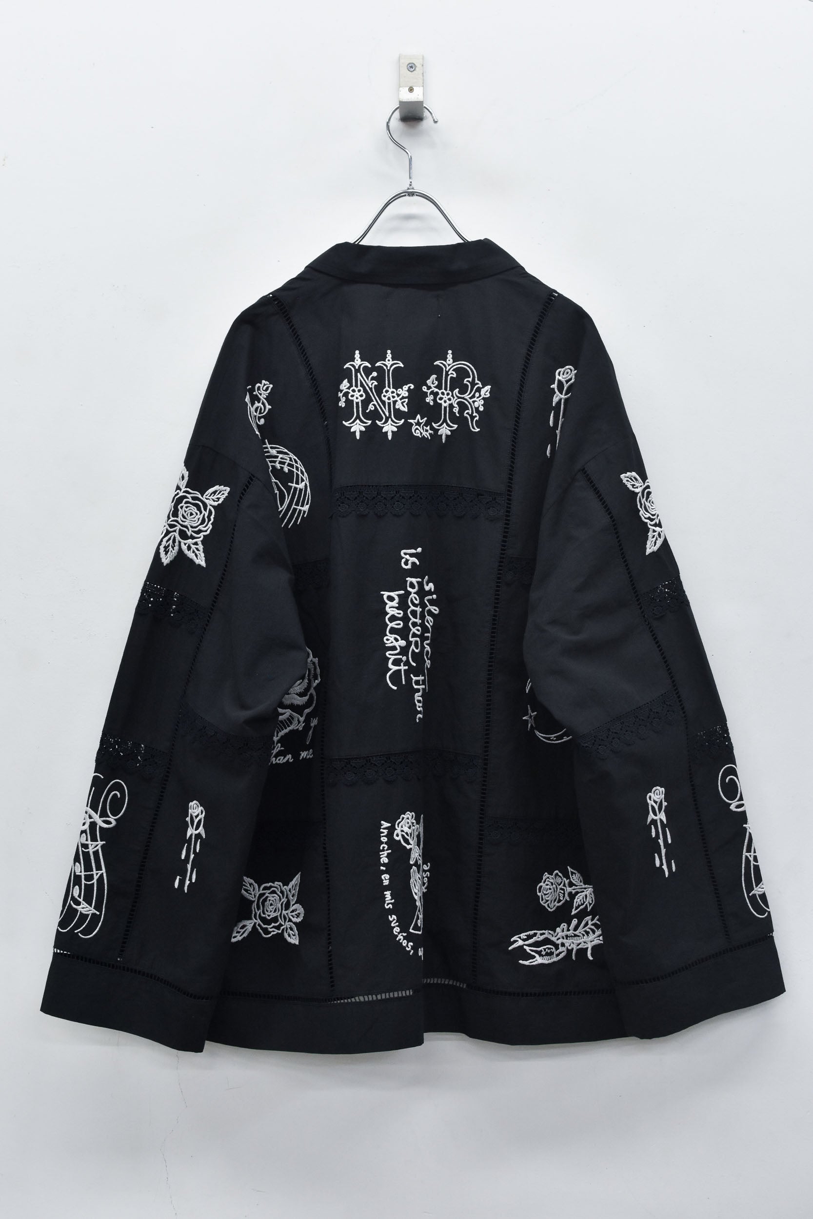 10種類以上の柄を前後左右にレース始末と刺繍を施したアートピースのようなシャツジャケット。