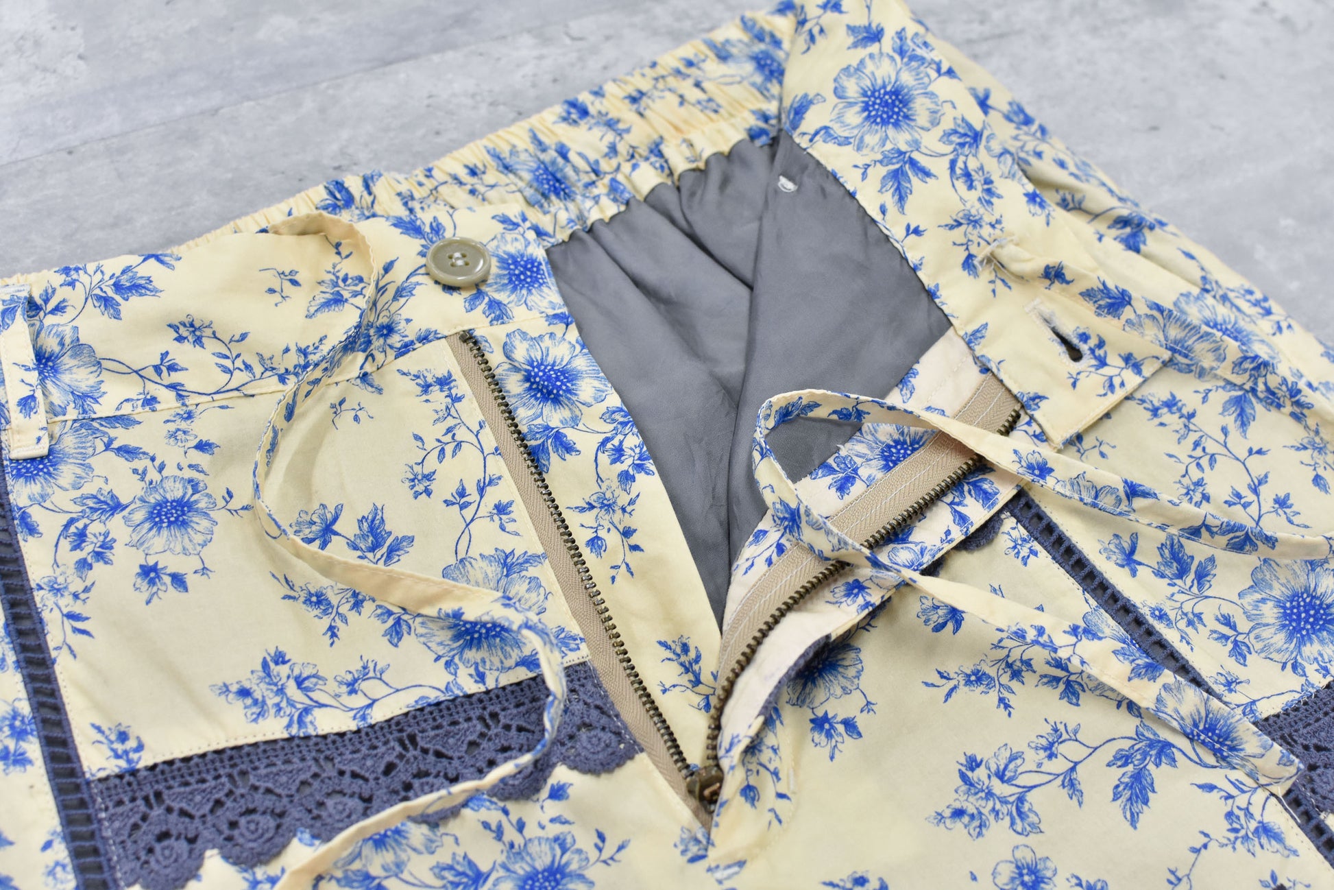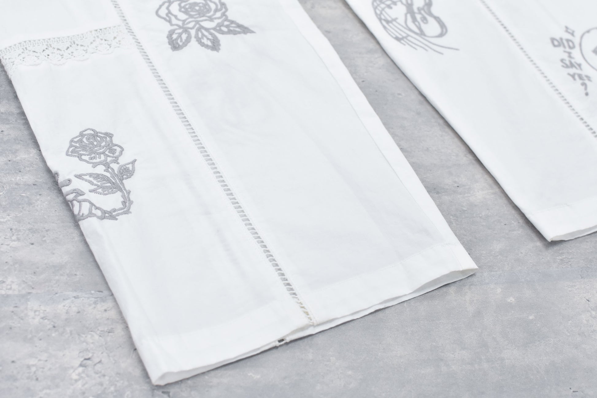 10種類以上の柄を前後左右にレース始末と刺繍を施したアートピースのようなワイドパンツ。