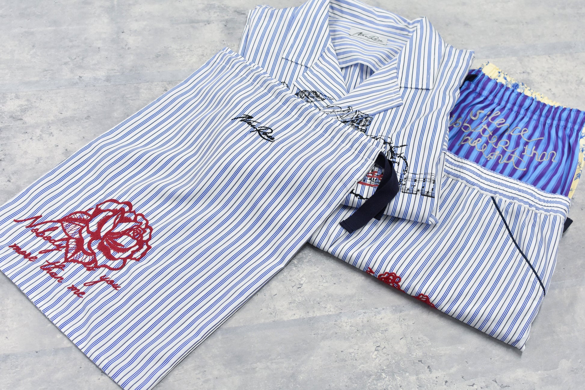 Pajama Jacket 、Pajama Pants、Pajama Shortsと 同生地のドローストリングバッグ。