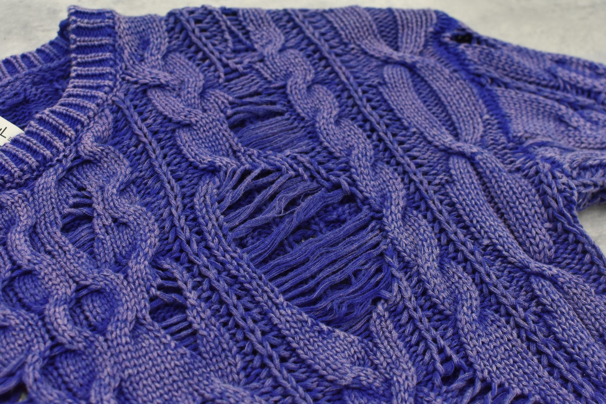 全体的に目飛ばし、目落としなどの編みを施し、ダメージを表現。