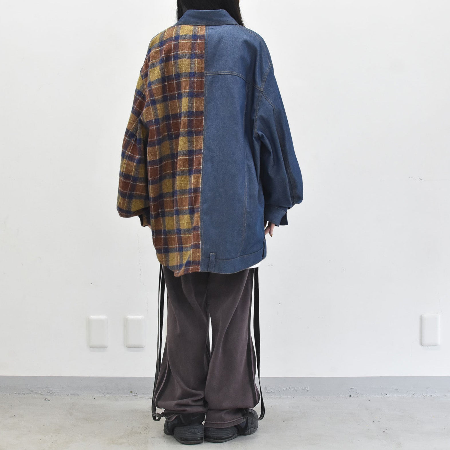 右サイドはGジャン、左サイドはチェックシャツがドッキングしたワイドシルエットシャツ。