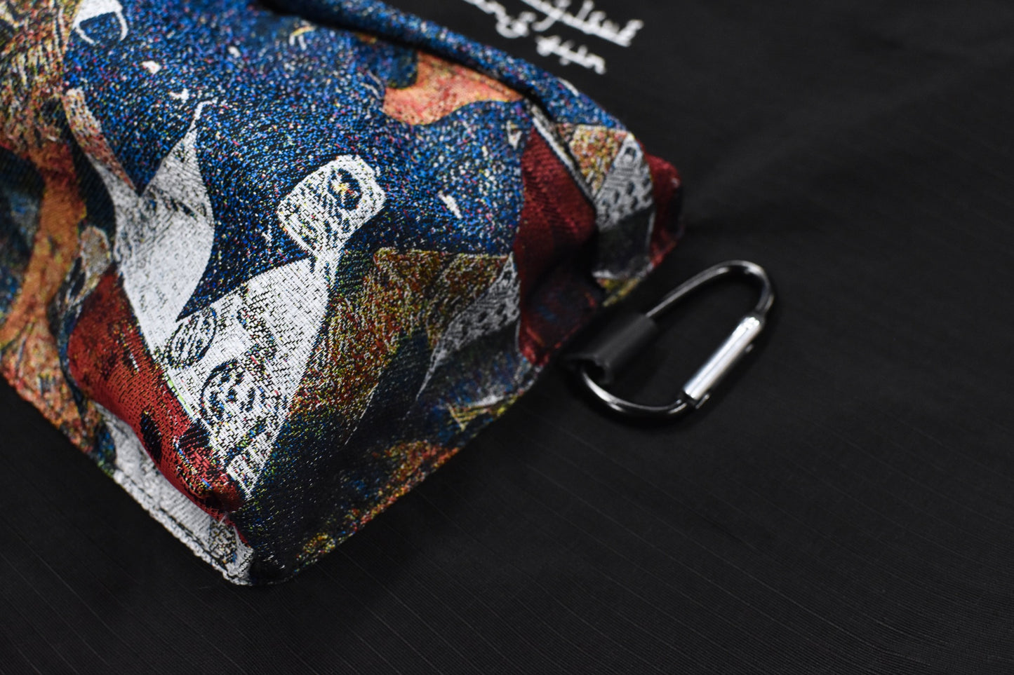 ごつめのバックルと太いカラビナが付属した、斜め掛けの袈裟型バッグ。