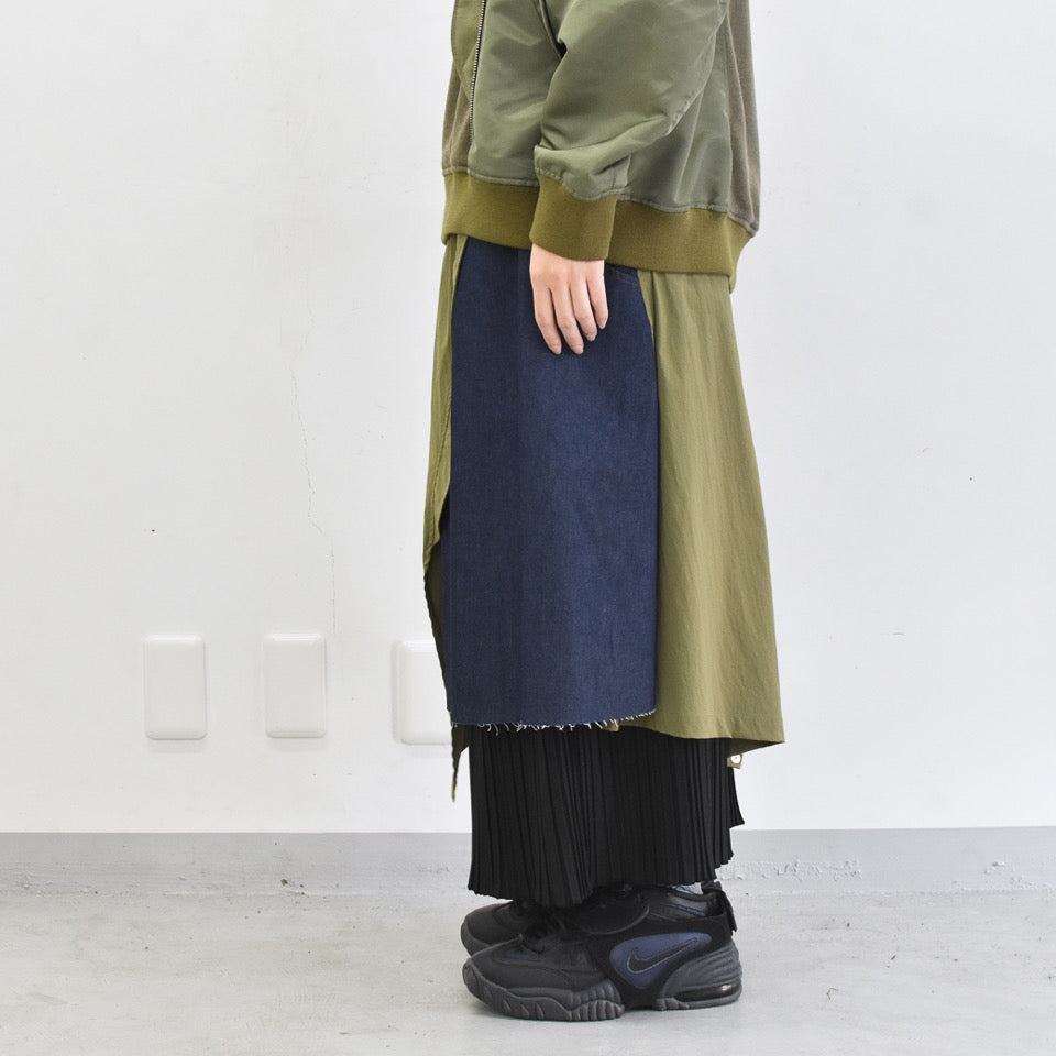 モッズコート、デニム、プリーツと異なるデイテールのアイテムを重ねたレイヤードスカート。